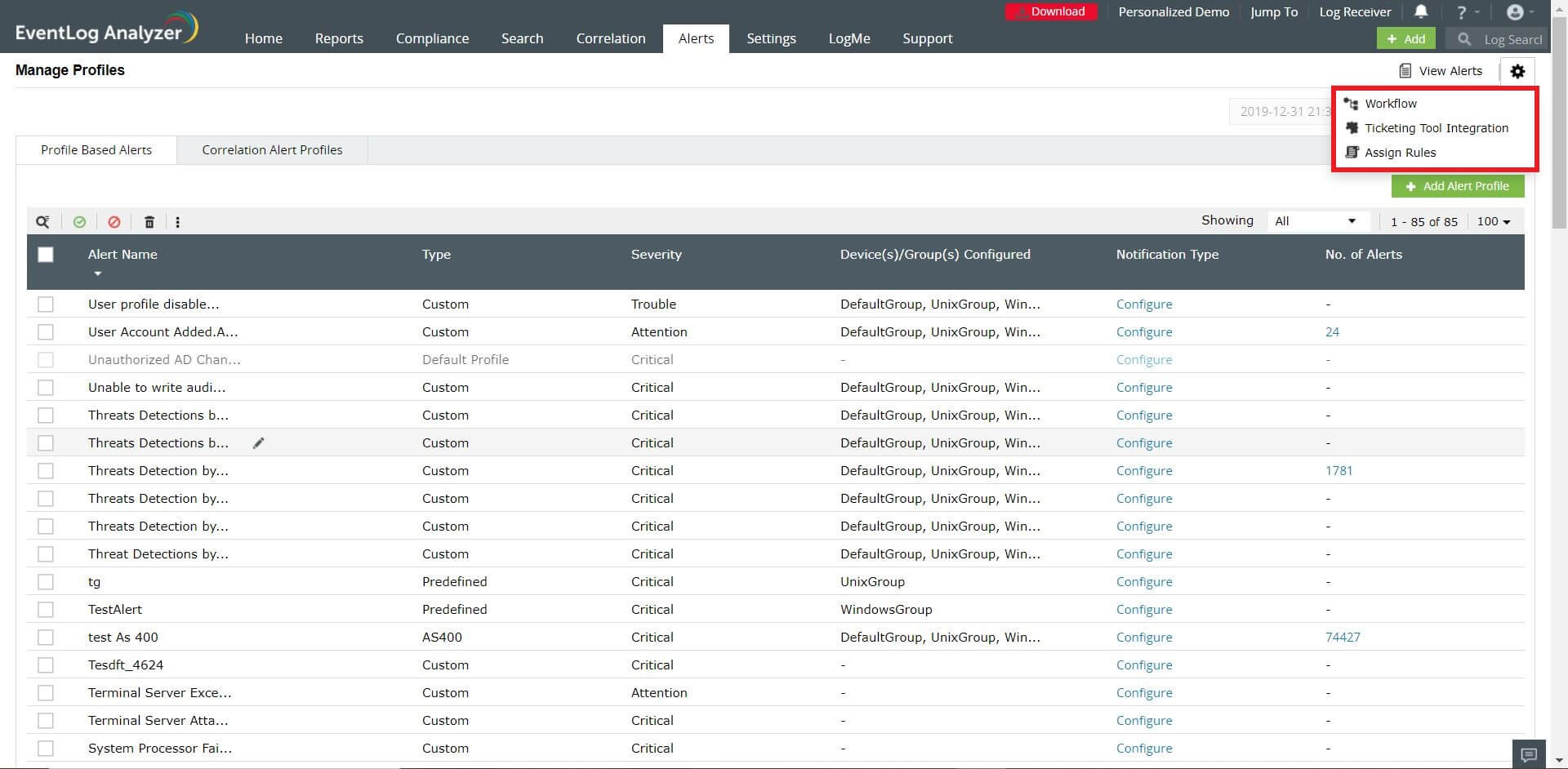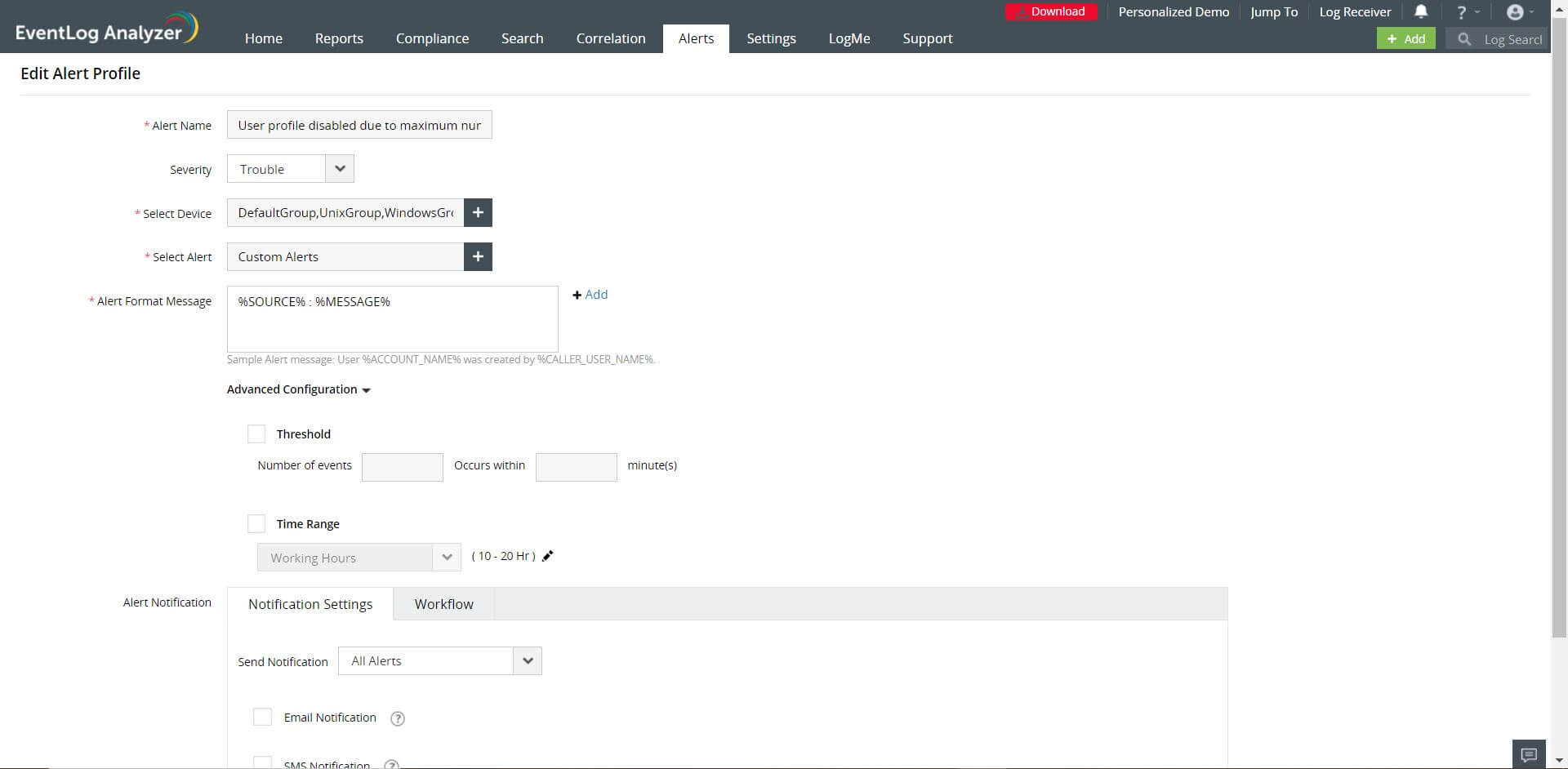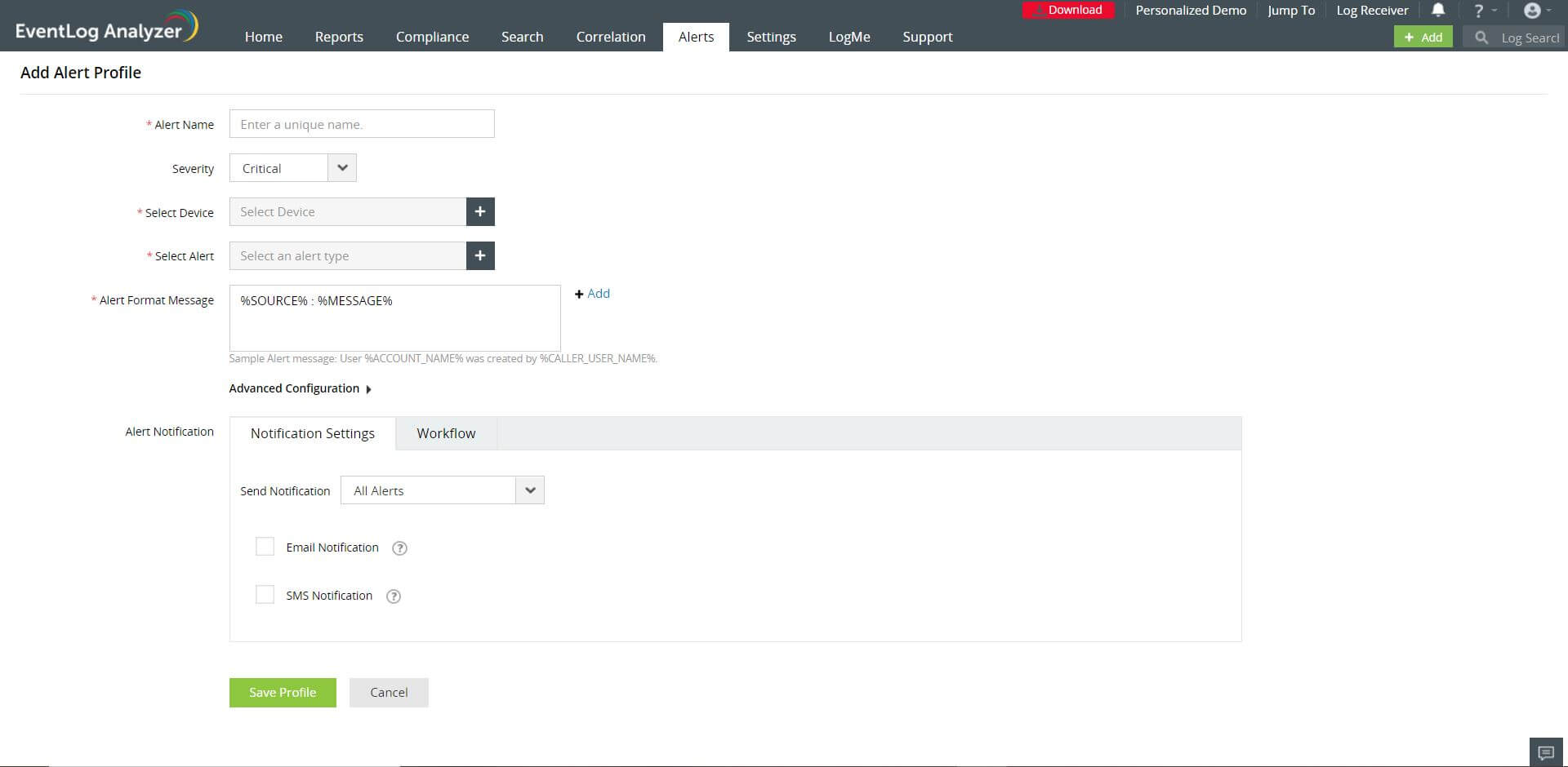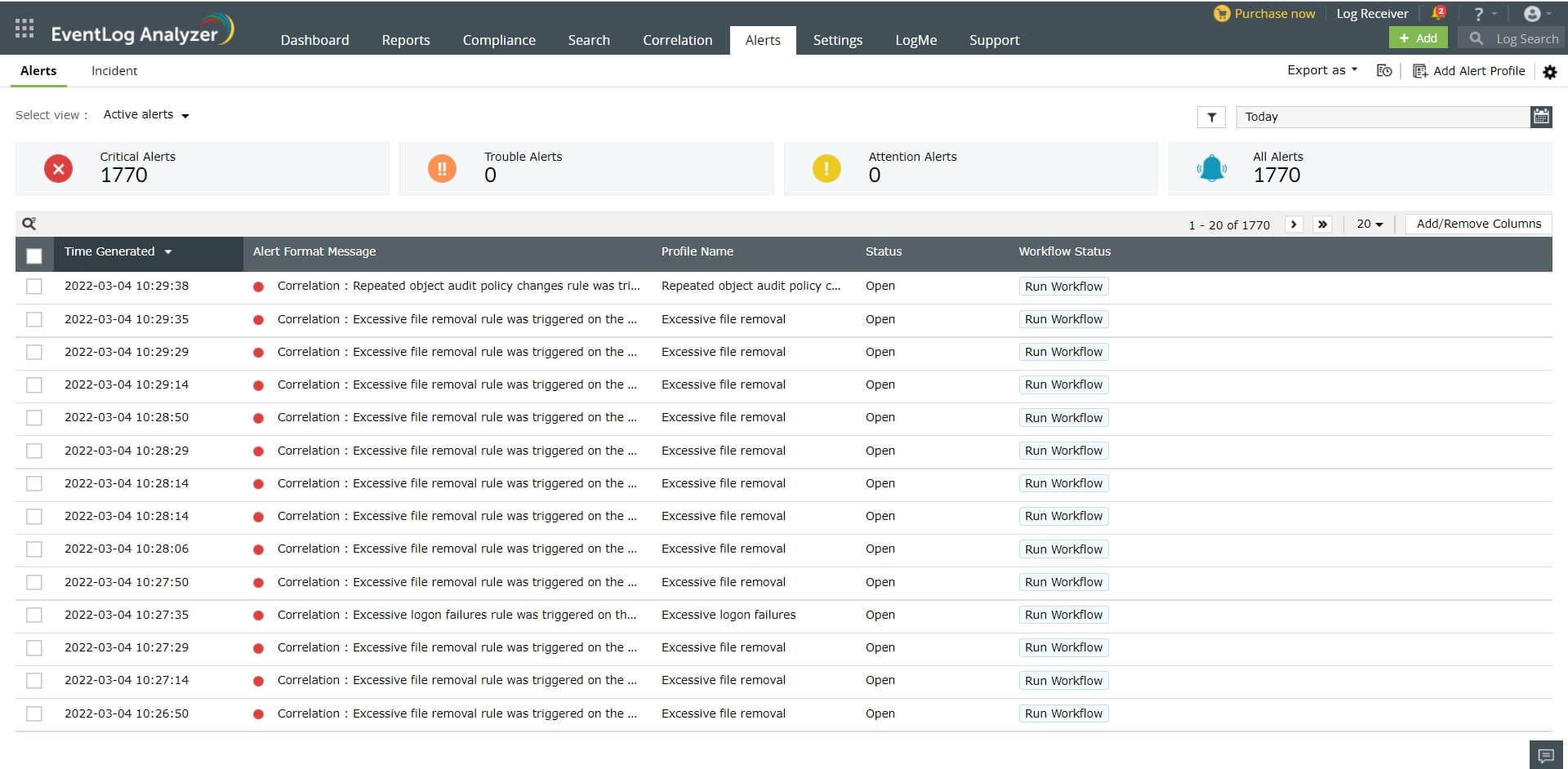 EventLog Analyzerは、アラート機能により、注意する必要があるセキュリティイベントに関する情報を提供します。
