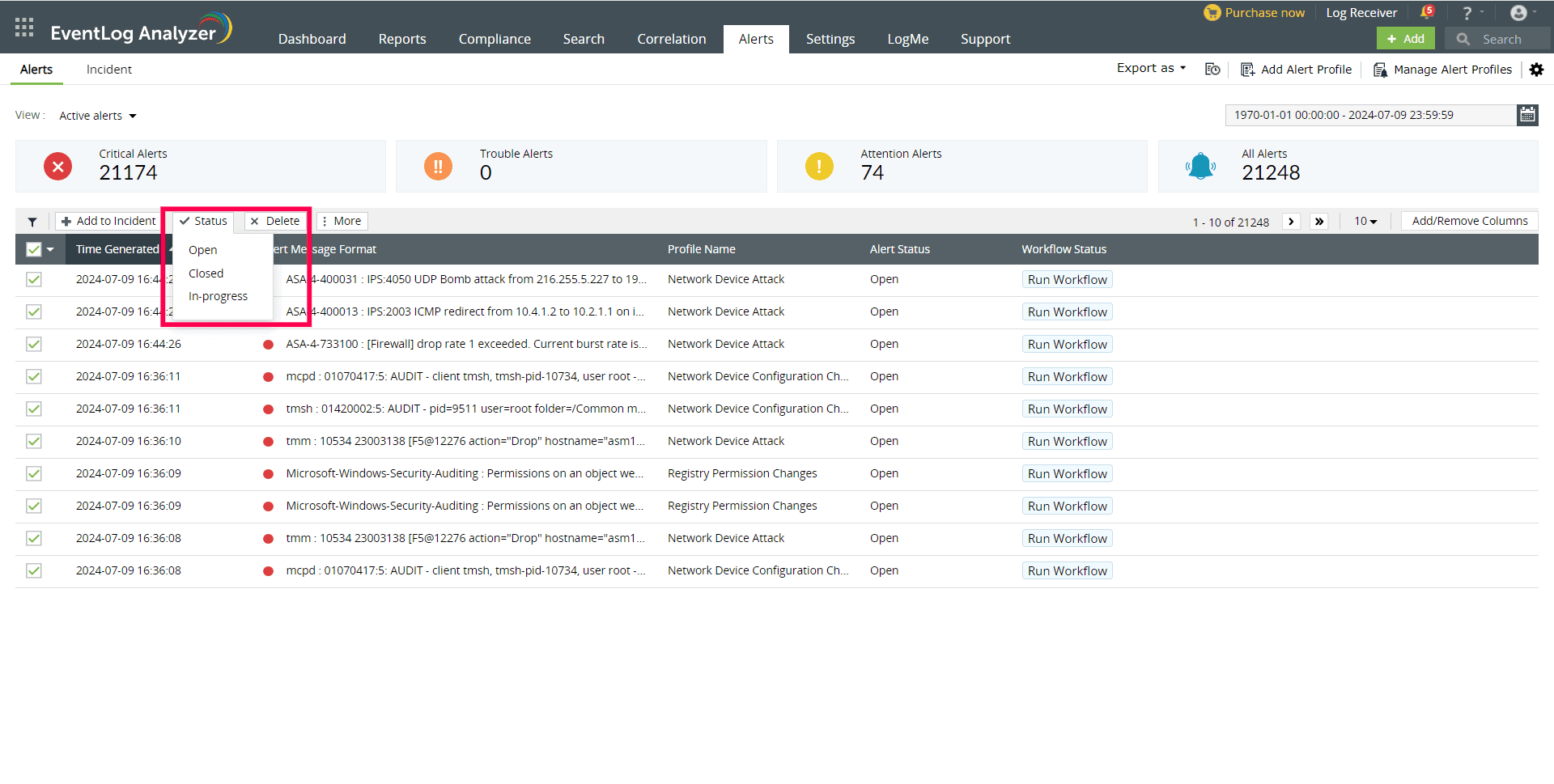 - アラートを削除する場合は[削除]を選択し、アラートのステータスを変更する場合は[ステータス]を選択します。