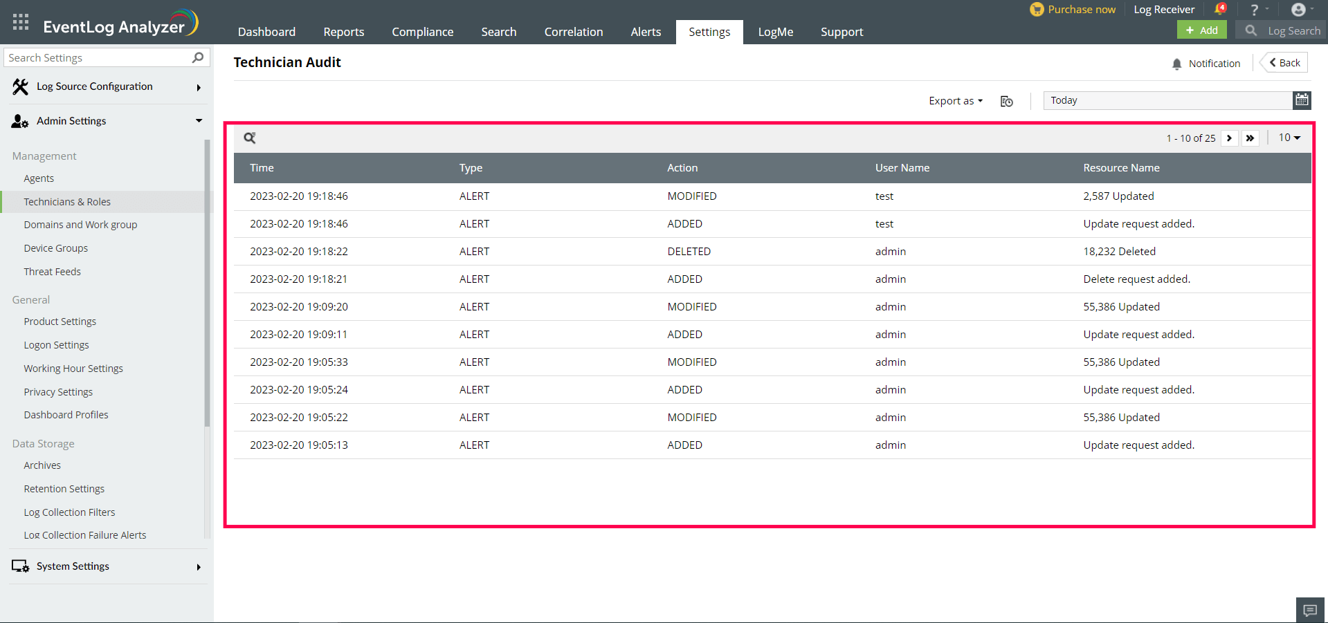 リクエストの成功率または失敗率を確認し、変更リクエストの詳細を確認するには、[設定]タブ → [管理者権限] → [技術者と役割] → [ユーザー監査]に移動します。