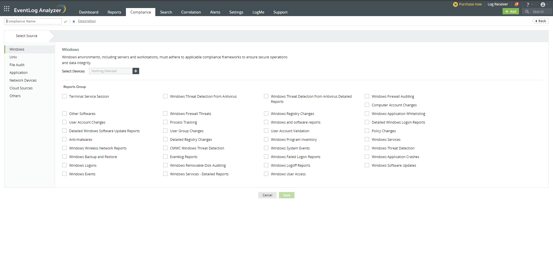 - [ログソースを選択]にて、作成するコンプライアンスレポートの対象となるデバイスを選択します。