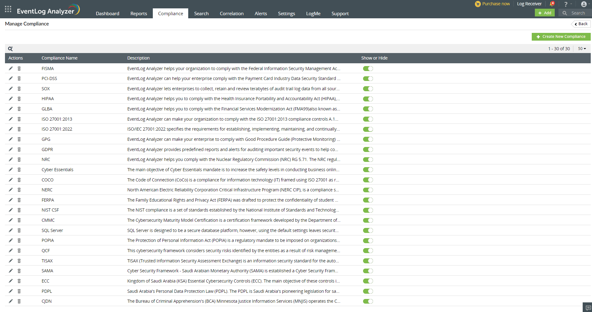 組織は、コンプライアンスに対応するために監査レポートを生成する必要があります。EventLog Analyzerは、FISMA、PDPA、CCPA、CPRA、PCI DSS 4.0、SOX、HIPAA、GLBA、POPIA、GPG13、Cyber Essentials、ISO 27001:2013、ISO 27001:2022、ISLP、NRC RG 5.71、GDPR、FERPA、NERC、CoCo、CMMC、NIST CSF、QCF、TISAX、SAMA、ECC、PDPL、CJDN、UAE-NESA、SOC 2、LGPDなどのIT規制に対応した事前定義の監査レポートを提供します。定義済みの監査レポートは自動的に生成され、無効化はできますが、削除することはできません。