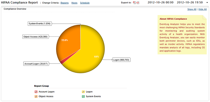 EventLog Analyzer を使用することで、インサイダー取引や情報開示陳述書などを簡単に監視できます。 HIPAA 規制は、OSやアプリケーションログを含む、全てのログ分析の統治を委任します。