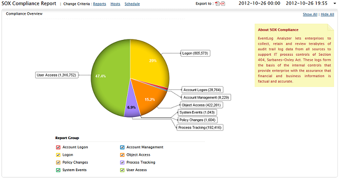 EventLog Analyzer は、SOX法 404 IT プロセスコントロールをサポートする全てのソースからの監査履歴ログデータのテラバイト単位のデータを収集、保持、表示することを可能にします。 財務やビジネス情報が事実に基づき、正確であることを保証します。