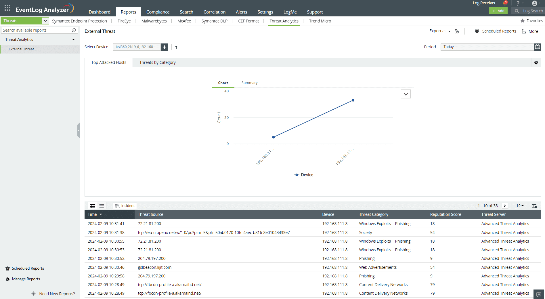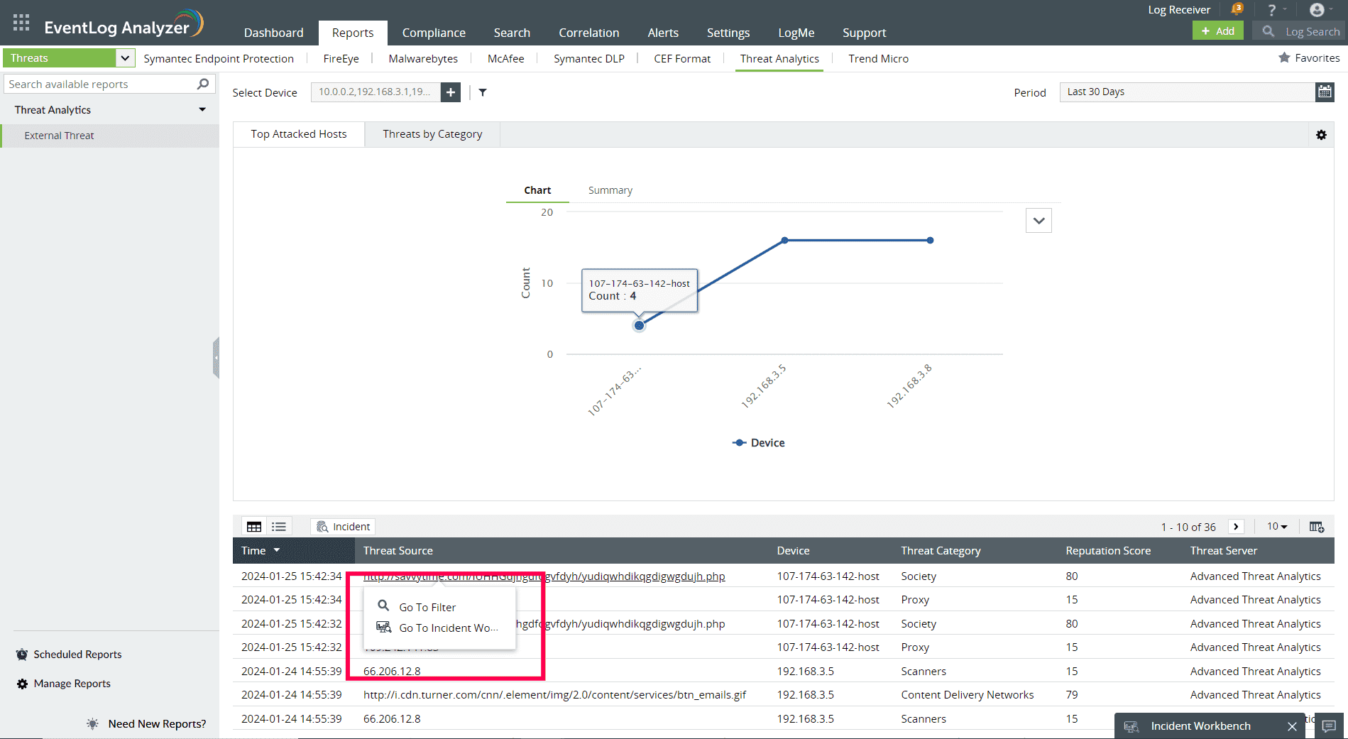 外部からの脅威レポートには、ソース、脅威の重大度、評判スコアなどの情報が含まれています。