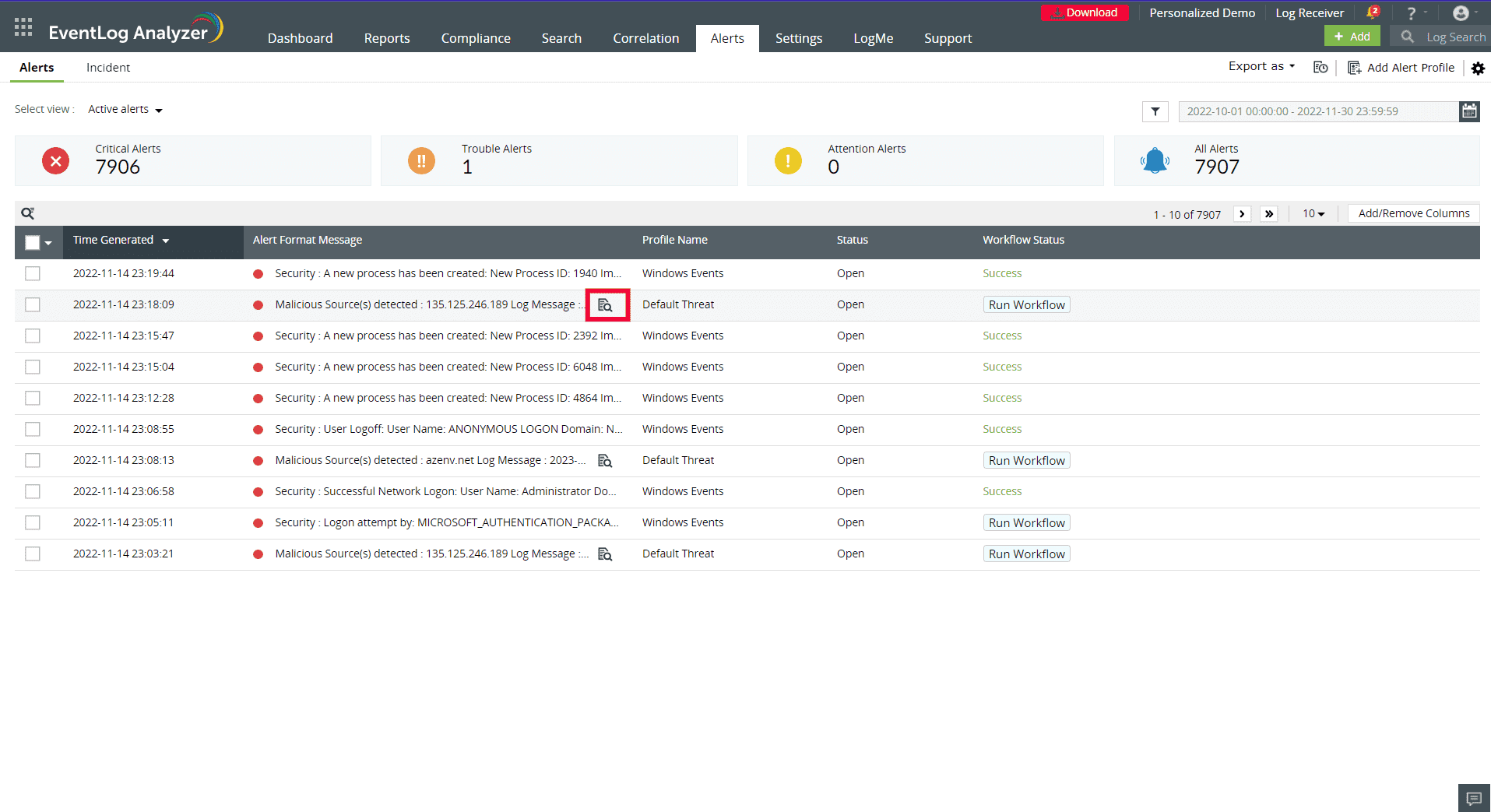 [アラート]タブでは、アラートの[脅威分析]アイコンをクリックすることで、インシデントワークベンチを開いて分析を行えます。