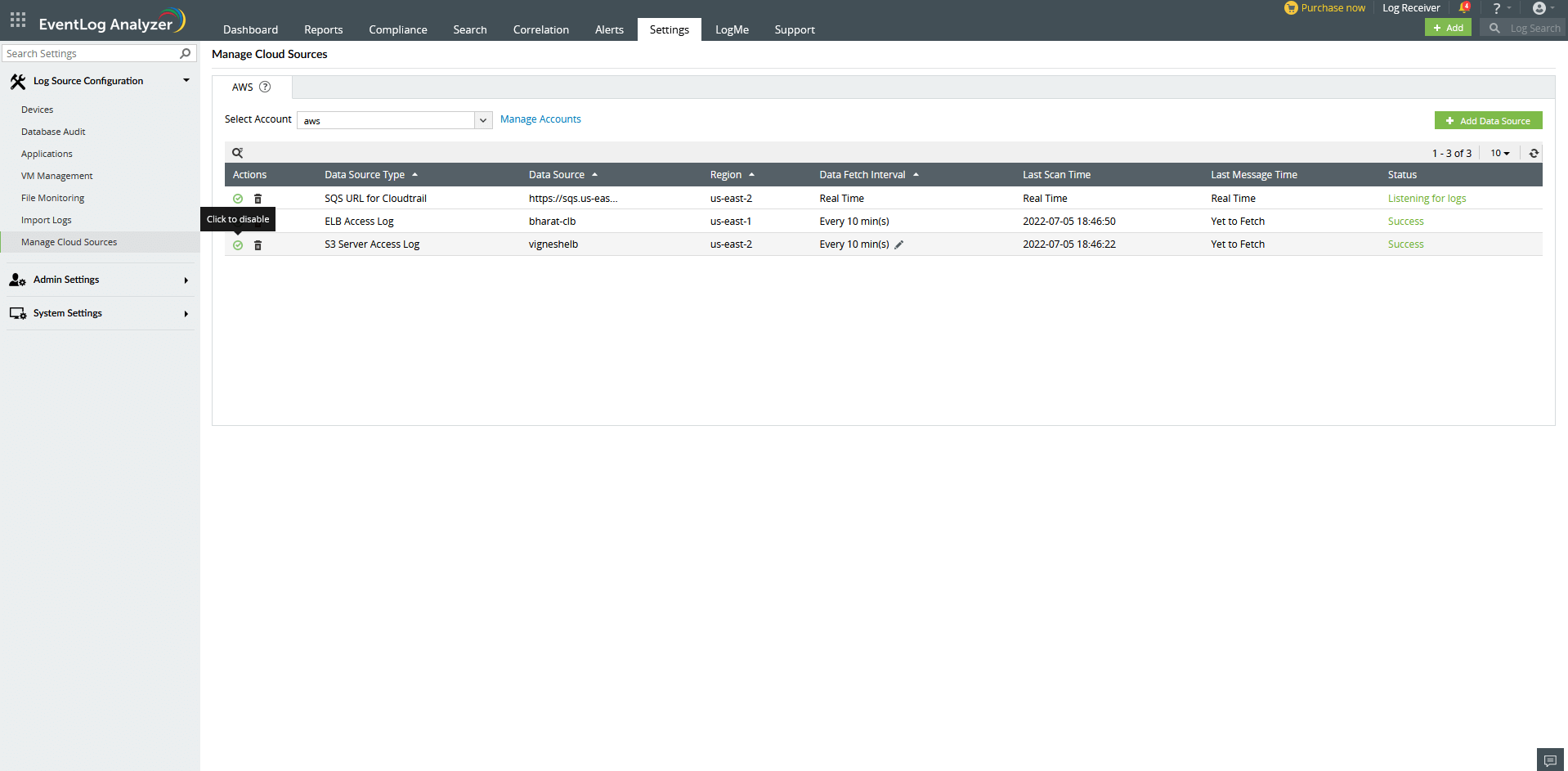 以下の手順で、Amazon S3サーバーアクセスログを、EventLog Analyzerのデータソースとして追加できます。