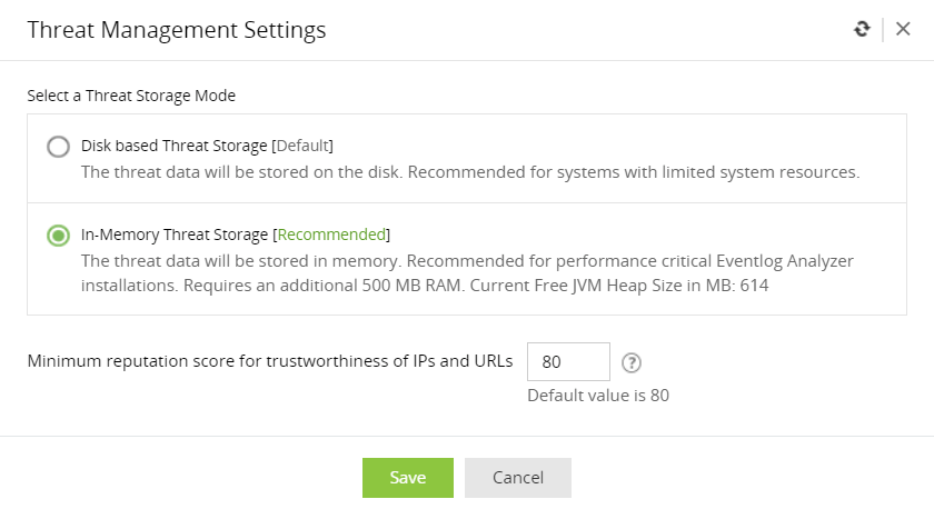 - [ディスクベースの脅威ストレージ]と[インメモリ脅威ストレージ]のどちらかを選択します。[IPとURLの信頼性に関する最小レピュテーションスコア]を設定することもできます。