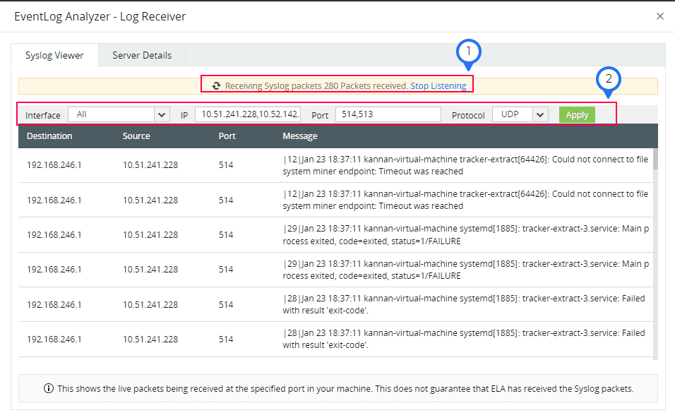 - リストには、マシンの指定ポートで受信しているライブパケットが表示されます。これは、EventLog AnalyzerがSyslogパケットを受信したことを保証するものではありません。
