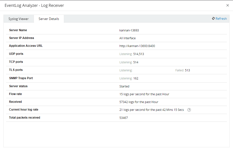 Syslog受信状況は、受信中のログなどの補足情報や、EventLog Analyzerがインストールされているサーバー名、TCPポート、IPアドレスなどのサーバー関連の詳細を提供することで、セキュリティアナリストの業務を支援します。(図1を参照)