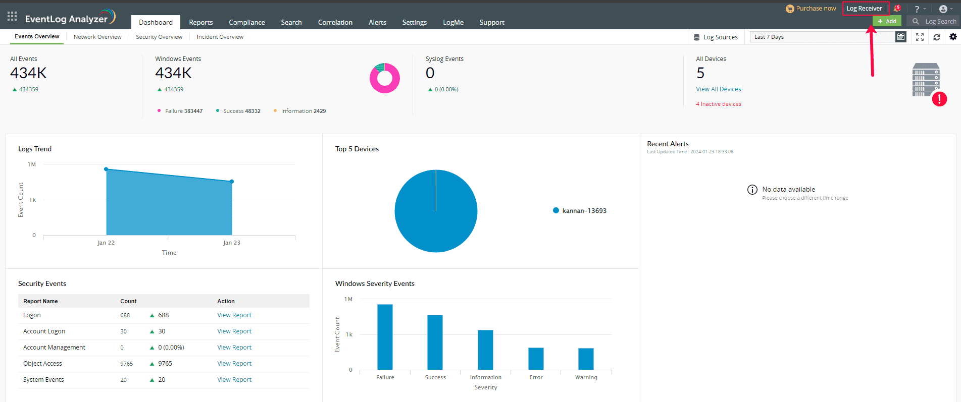 図1:EventLog AnalyzerのSyslog受信状況
