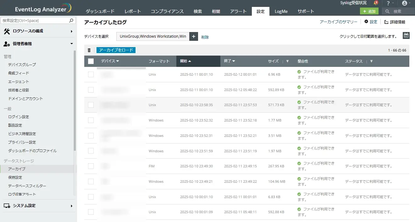 「EventLog Analyzer」は、WindowsやUnixホスト、ルーター/スイッチなどから収集したログを自動的にアーカイブして保管します。ログデータをアーカイブすることで、ストレージの容量を効率的に活用できるようになります。