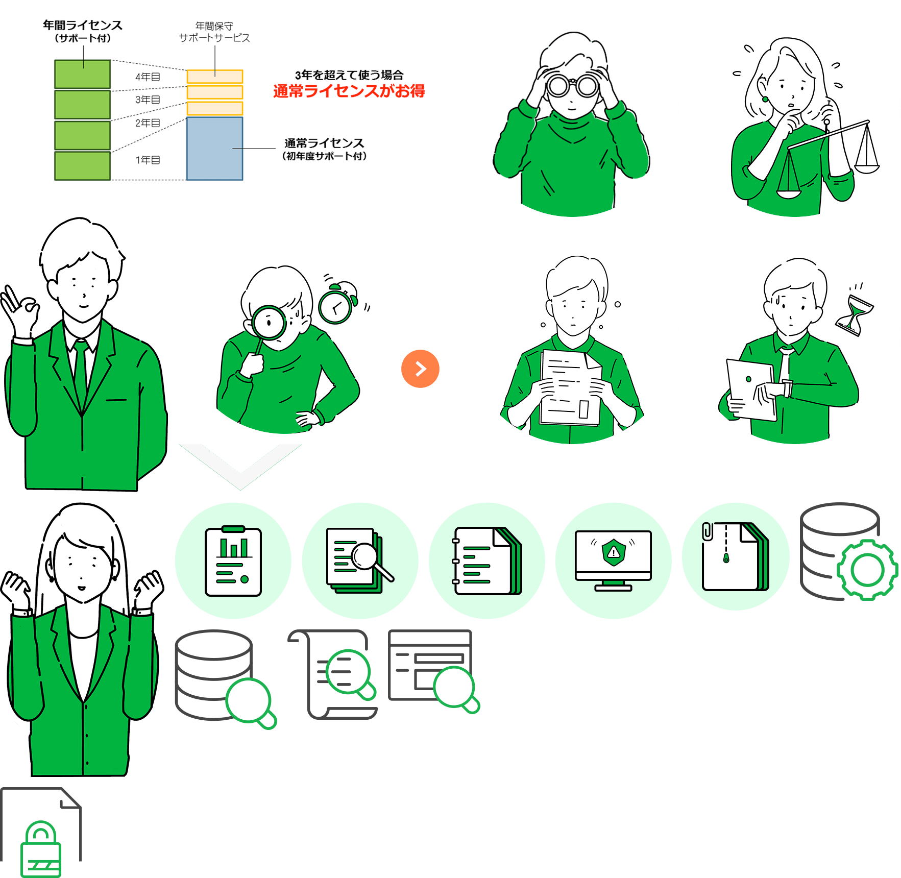 1年間利用可能な製品ライセンスで、年間保守サポートサービスが含まれています。1年ごとに年間ライセンス契約を更新します。
