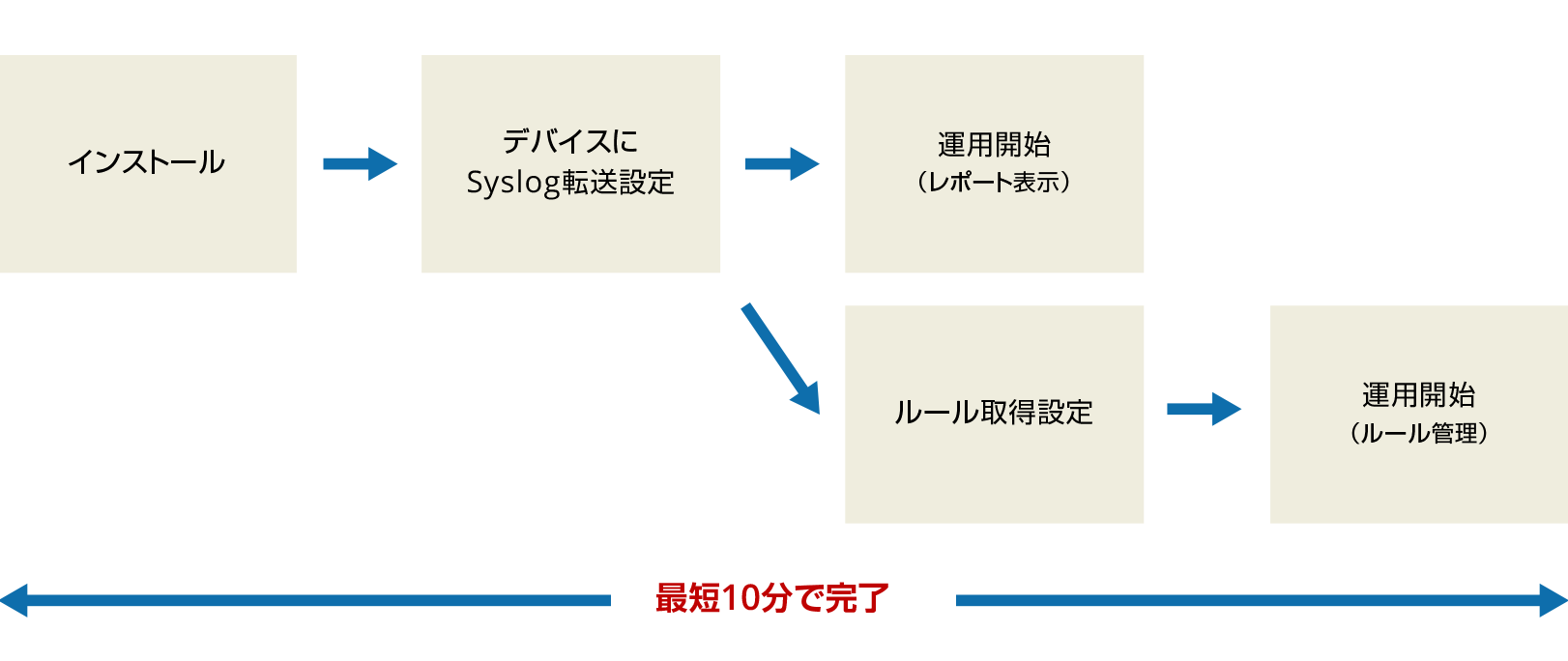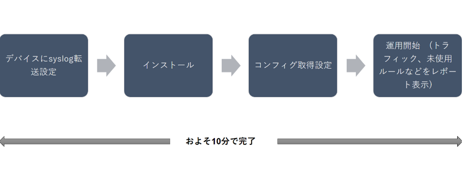 Firewall Analyzerは「導入が簡単」なところもご好評頂いております。専用サーバーへのソフトウェアインストールやデバイス側の設定も含め、最短10分程でレポートの出力を開始できます。