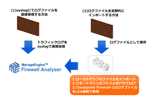 Firewall Analyzerで管理対象装置のログを収集、解析するために、以下のいずれかの方法でログを取り込みます。