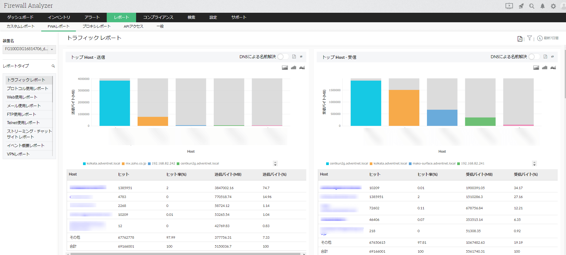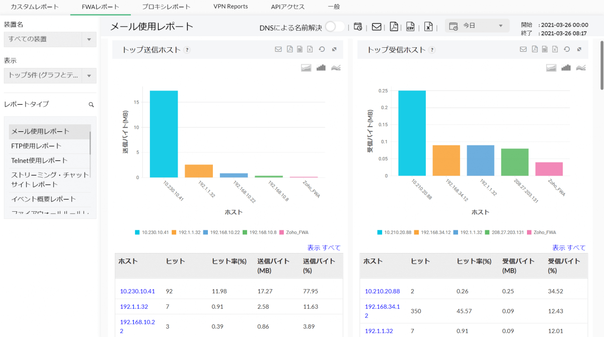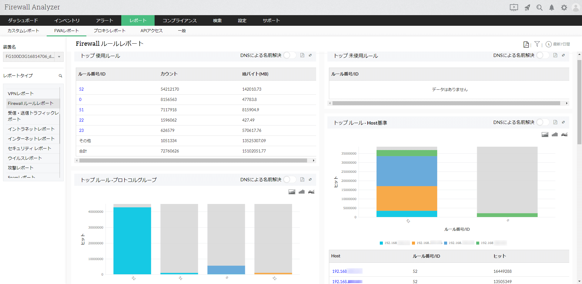 ファイアウォールルールレポート は、対象のファイアウォールで設定されているルールの使用状況、使用頻度の高いHost情報をレポートとして生成します。