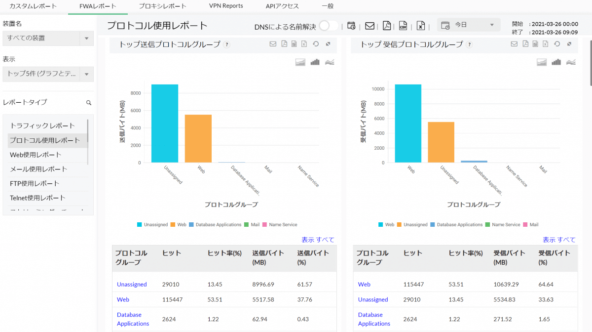 プロトコル使用レポートでは、すべてのプロトコルグループの帯域使用状況とHost、ユーザー情報に関するレポートを出力します。プロトコルグループは、Web、メール、FTP、Telnet、Name Serviceなど豊富にございます。設定タブからプロトコルグループの新規追加や、各プロトコルグループに含まれるプロトコルの表示/編集することも可能です。