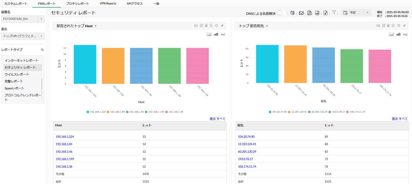 セキュリティレポートでは、ルール制御により拒否された通信(Deny通信)などをもとに、ホスト名、宛先、プロトコルなどの情報を表示します。