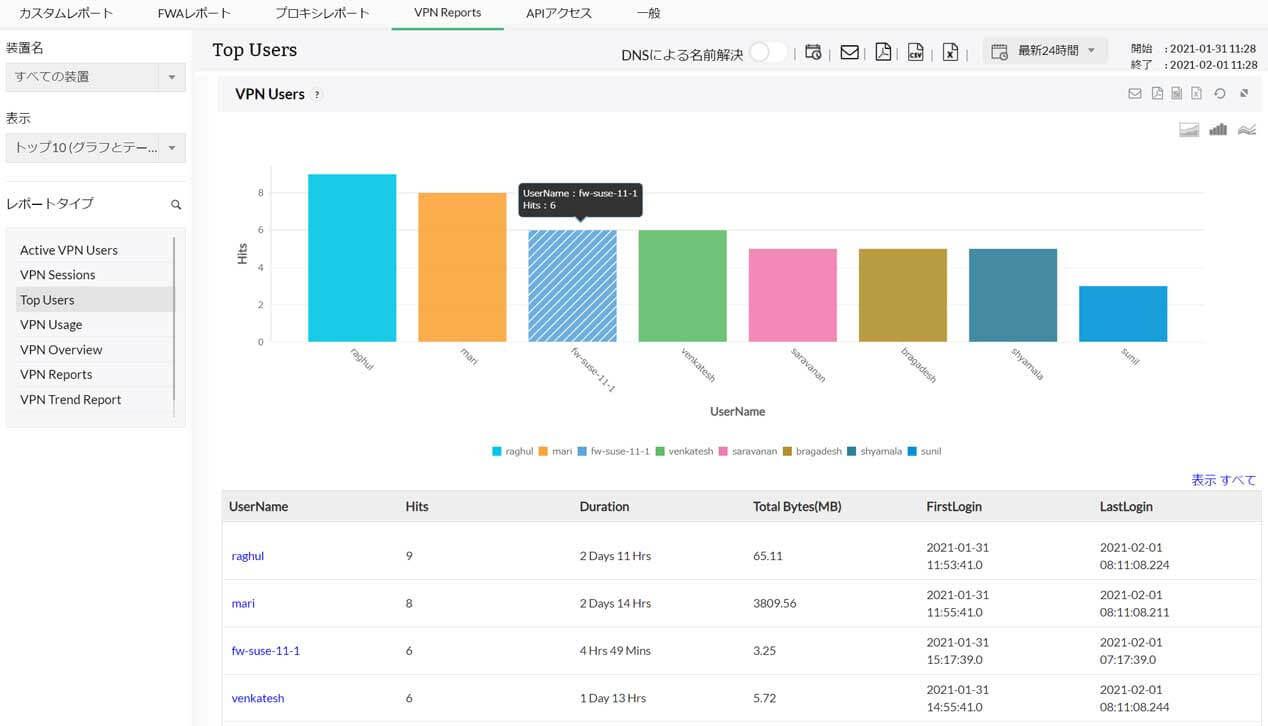 Top Usersレポートでは、VPN接続回数の多いユーザーを順に表示します。ヒット数の他に、合計接続時間やトラフィック量、初回/最終のログイン時刻を表示します。ユーザー名から掘り下げて、それぞれのセッションの詳細情報も把握できます。