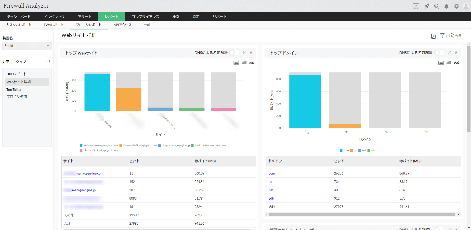 Webサイト詳細レポートでは、プロキシサーバーを介して通信が発生した際の、Webサイト、ドメインなどの情報をレポートで生成します。 社内のWebアクセス利用状況の把握に活用されます。