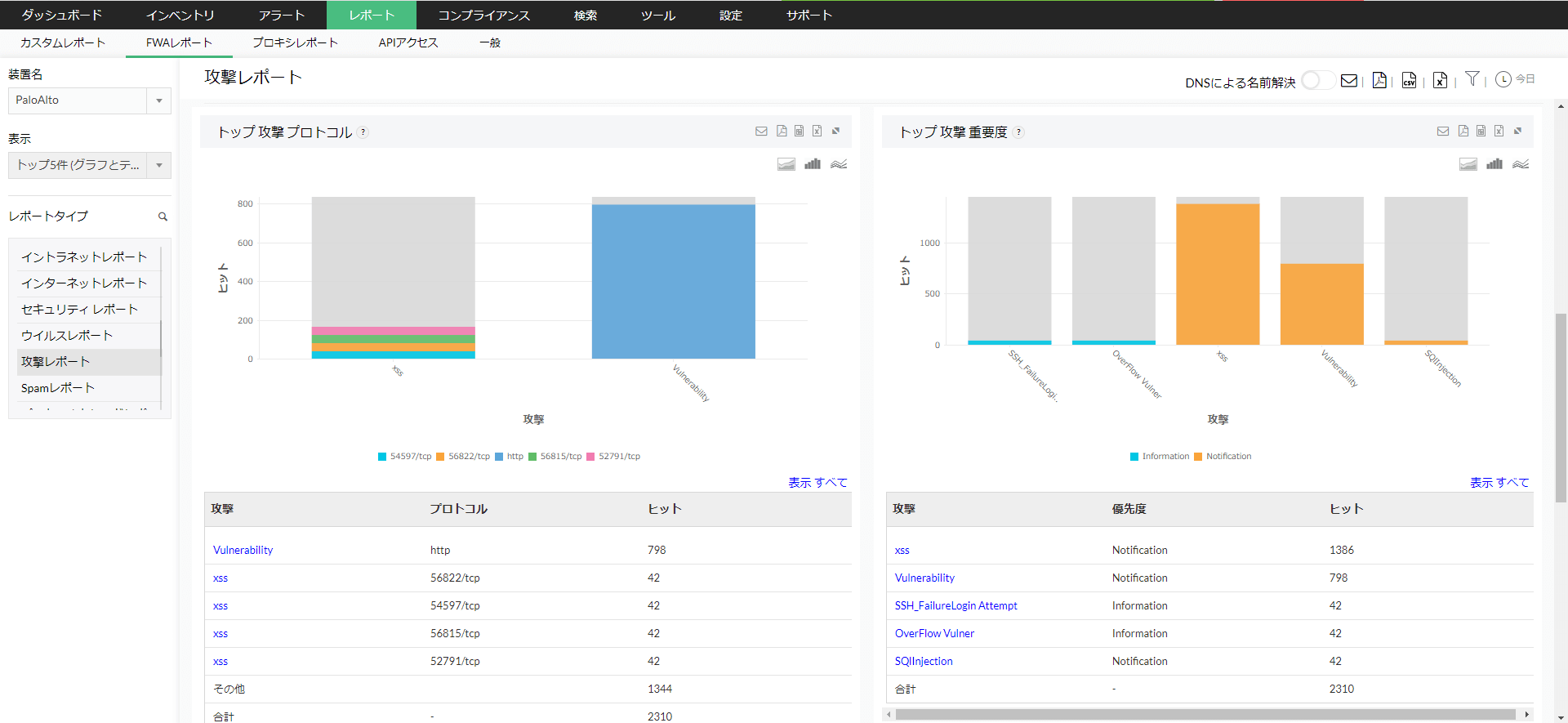 ファイアウォールで検知された攻撃情報をレポートとして表示します。 このレポートでは、攻撃者/攻撃ターゲット、攻撃プロトコル、攻撃ステータス(Permit/Deny)情報を表示します。