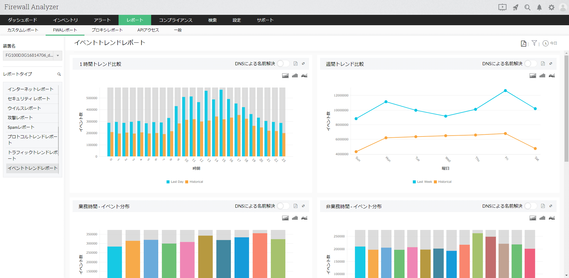 トレンドレポートでは、プロトコル使用、トラフィック量、イベント発生について時間帯ごとに表示します。以下の3種類のレポートがございます。
