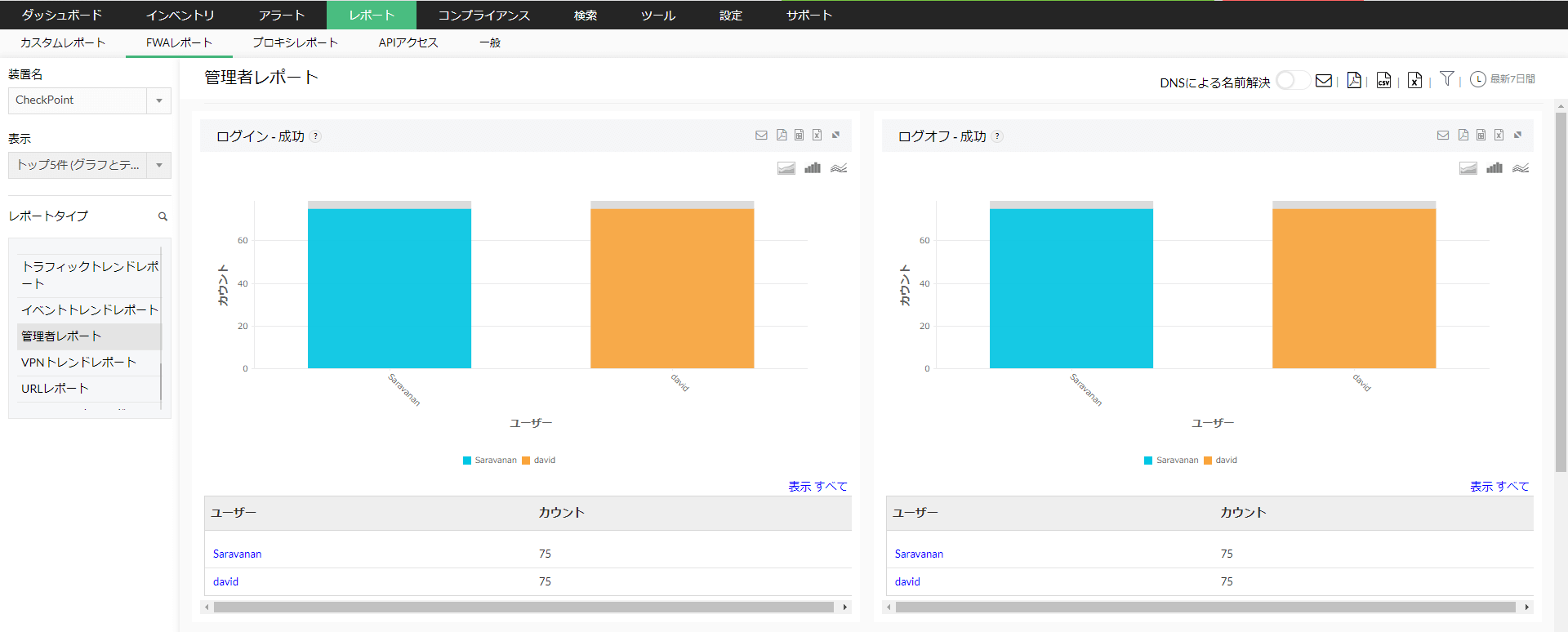 ファイアウォールへアクセスしたユーザーのログオン/ログオフの成功/失敗イベントをレポートします。 管理者レポートはCisco PIX, NetScreen, FortiGate, Identiforce Gateway が対象です。