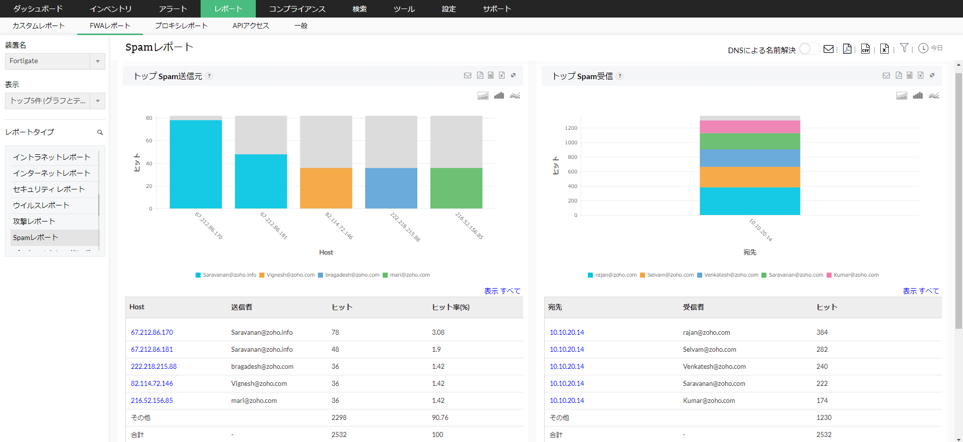 ファイアウォールで検知されたSpam情報をレポートとして表示します。 このレポートでは、ネットワークに悪影響を与えた ウイルスとワームを特定するのに役立ち、被害範囲の分析と攻撃の送信元の追跡をします。