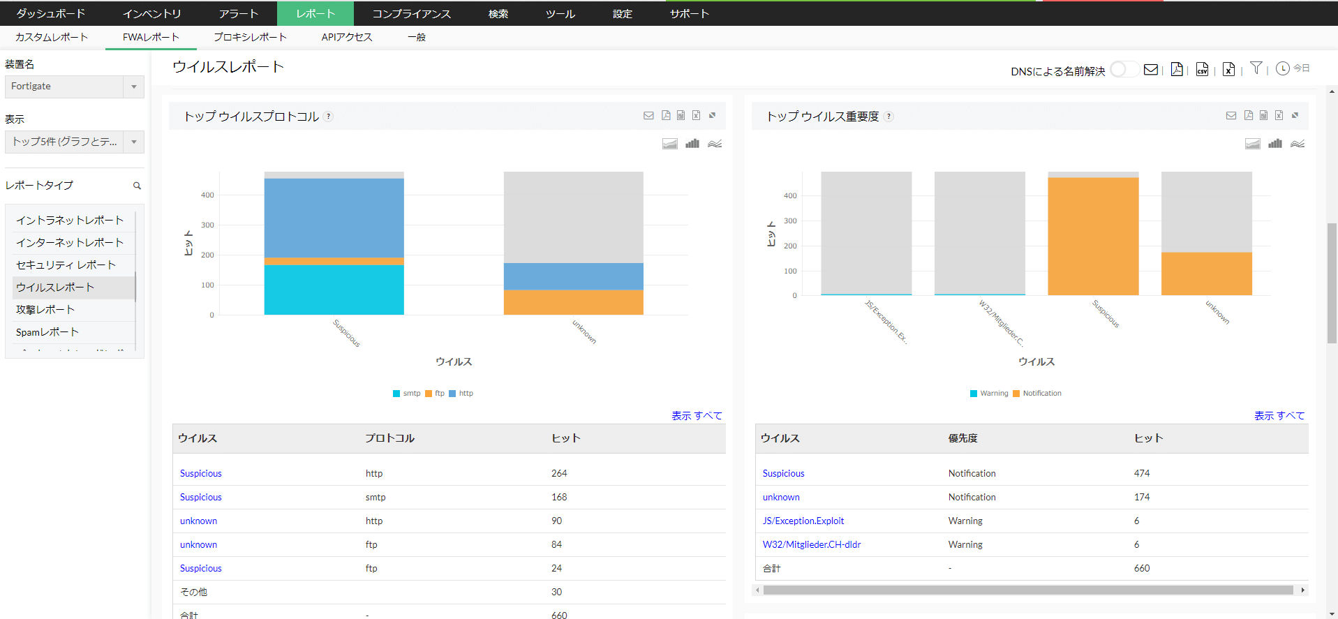 ファイアウォールで検知されたウイルス情報をレポートとして表示します。 このレポートでは、ウイルスの送信/受信Host、ウイルスプロトコル、ウイルスステータス(Permit/Deny)情報を表示します。