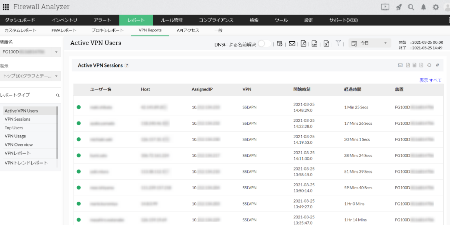アクティブVPNユーザーレポートは、リアルタイムでVPN通信を行っているアクティブなユーザー情報を表示します。