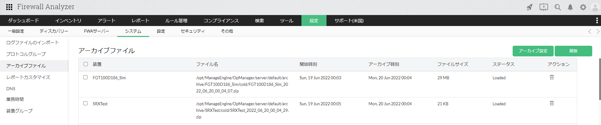 [設定]→[システム]→[アーカイブファイル]画面では、監視対象装置の生ログがZipファイルとして圧縮された際のファイル名、アーカイブ時刻、ファイルサイズ等の情報が一覧で表示されます。