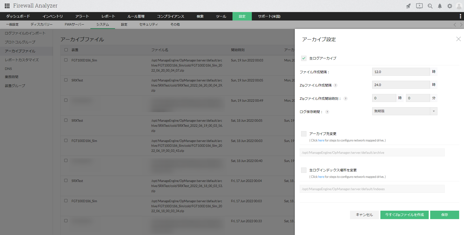 Firewall Analyzerは、監視対象装置からsyslogを受信後、インストールフォルダー内にアーカイブファイルを作成し、定期的にZip化します。