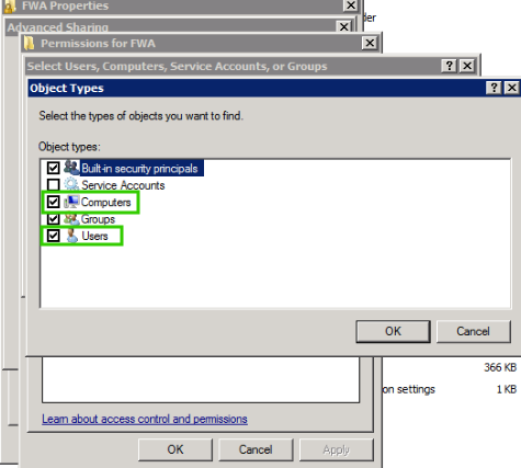 - 「オブジェクトの種類」をクリックし、「コンピューター」と「ユーザー」がチェックされていることを確認
