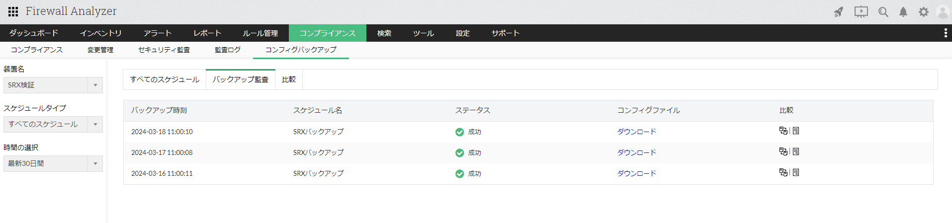 スケジュールに応じたバックアップの取得日時やステータス、取得したコンフィグファイルのダウンロードを行います。