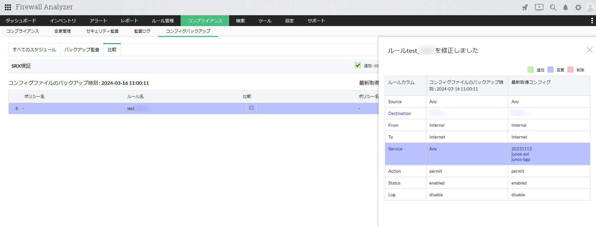 スケジュールバックアップで取得したコンフィグ情報をもとに、ルールまたはコンフィグに焦点をあてて、差分比較を行います。