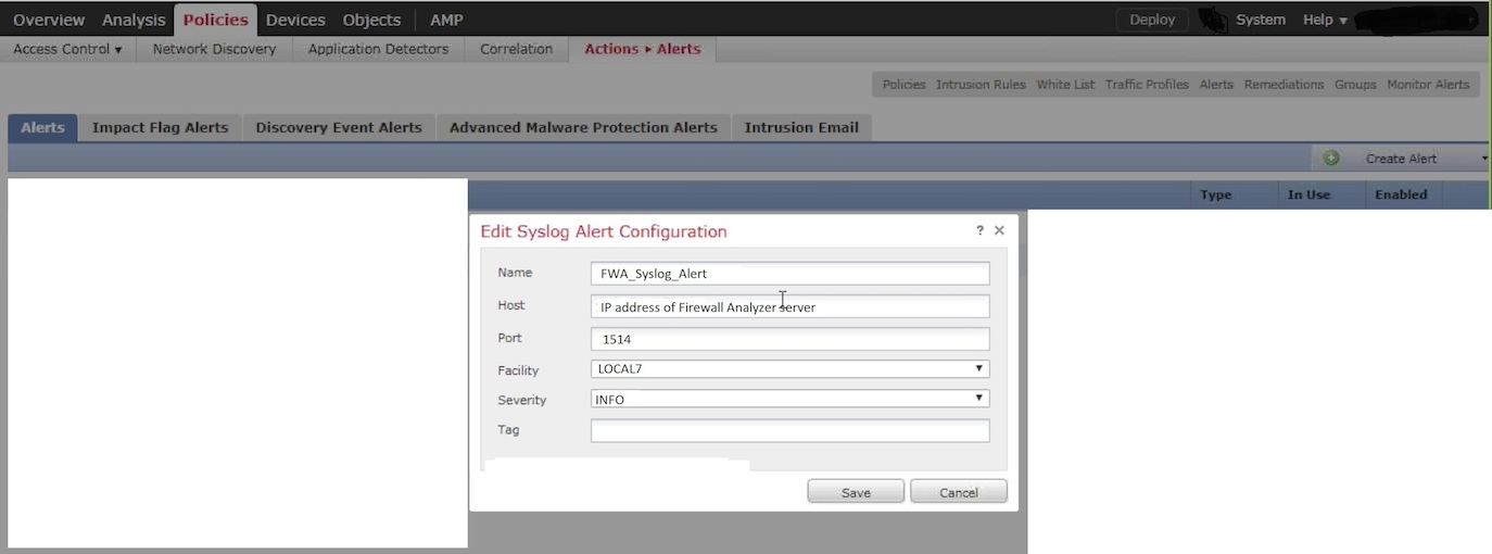 - [ASA Firepower Configuration]→[Policies]→[Actions]→[Alerts]を選択