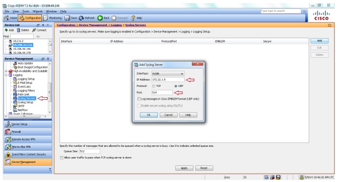 ・IP Address:ログの転送先となるsyslogサーバーのIPアドレス(Firewall AnalyzerのインストールサーバーのIPアドレス)