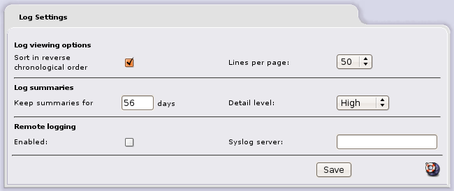 設定を変更後、Saveをクリックし変更内容を保存後、syslogdデーモンを再起動します。 - Sort in reverse chronological order: