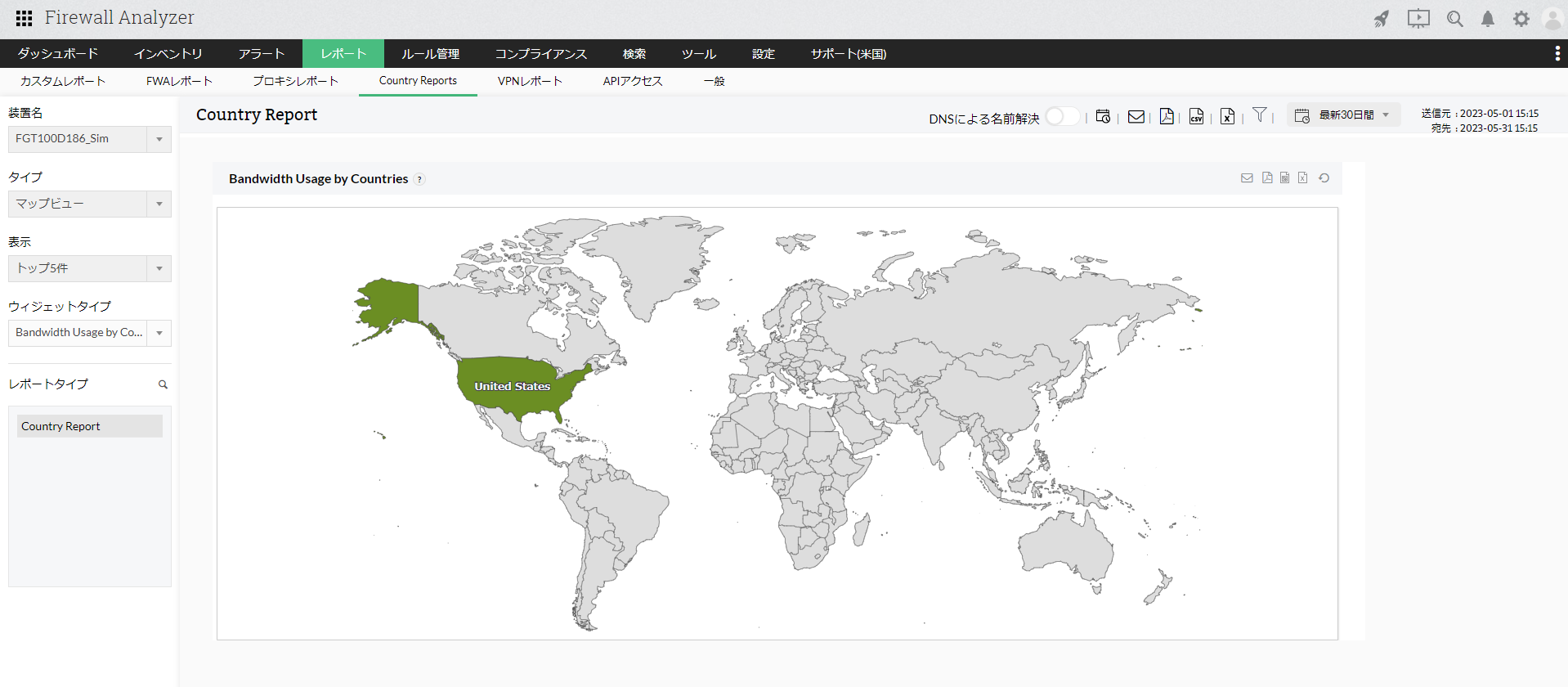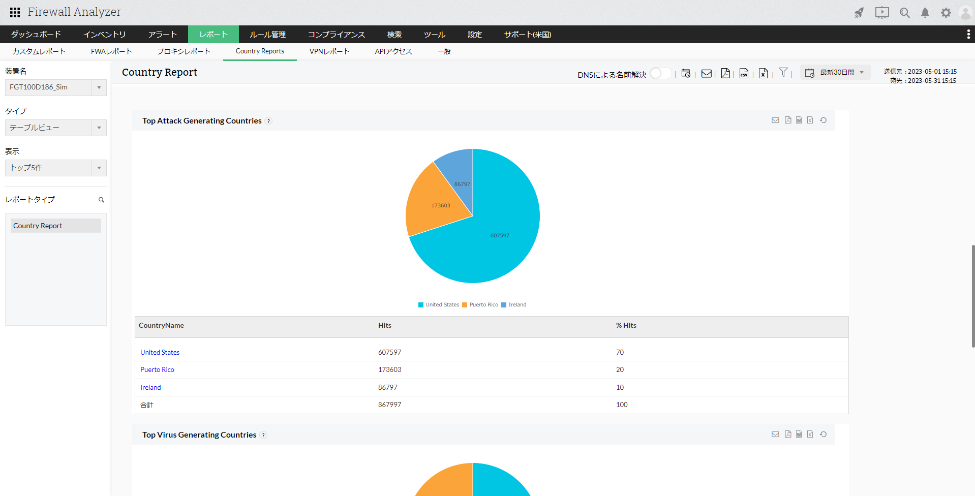 国ごとのレポート(Country Reports)は、トラフィック情報や、攻撃やウイルスなどのセキュリティにおける通信を国別に表示します。