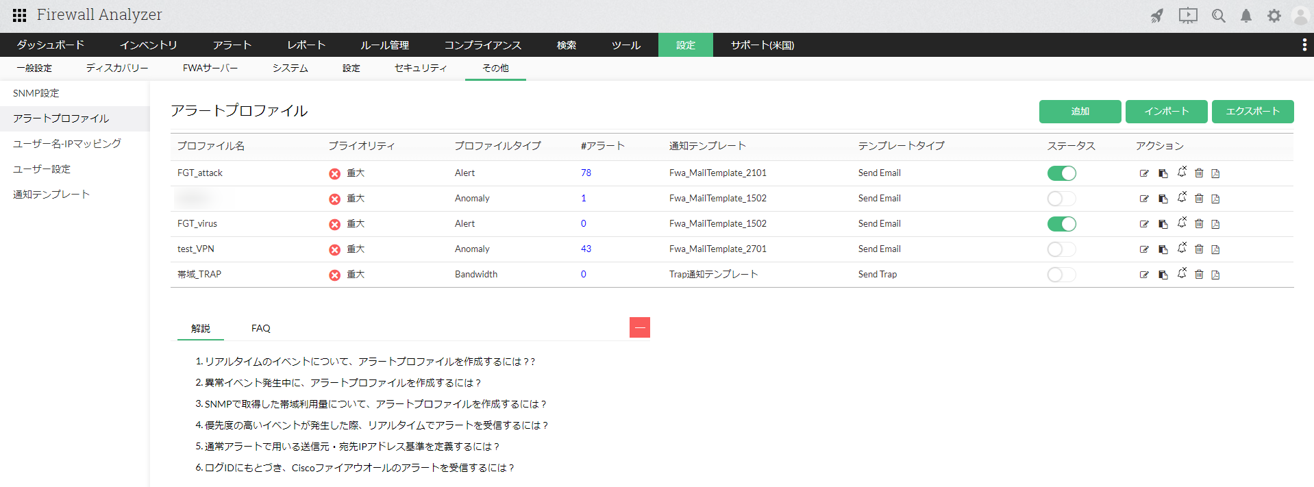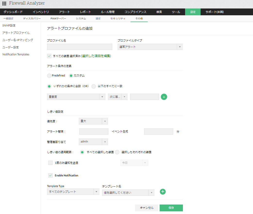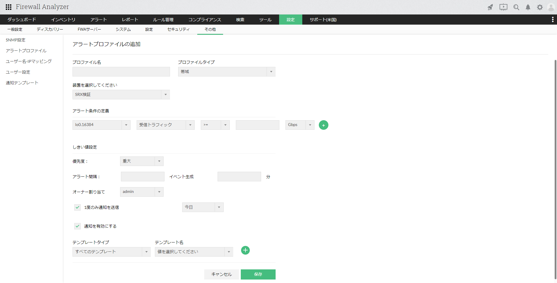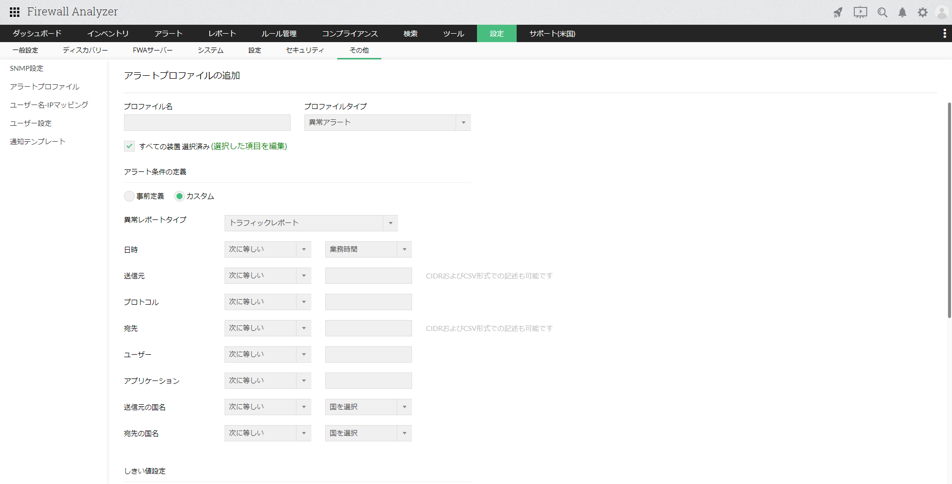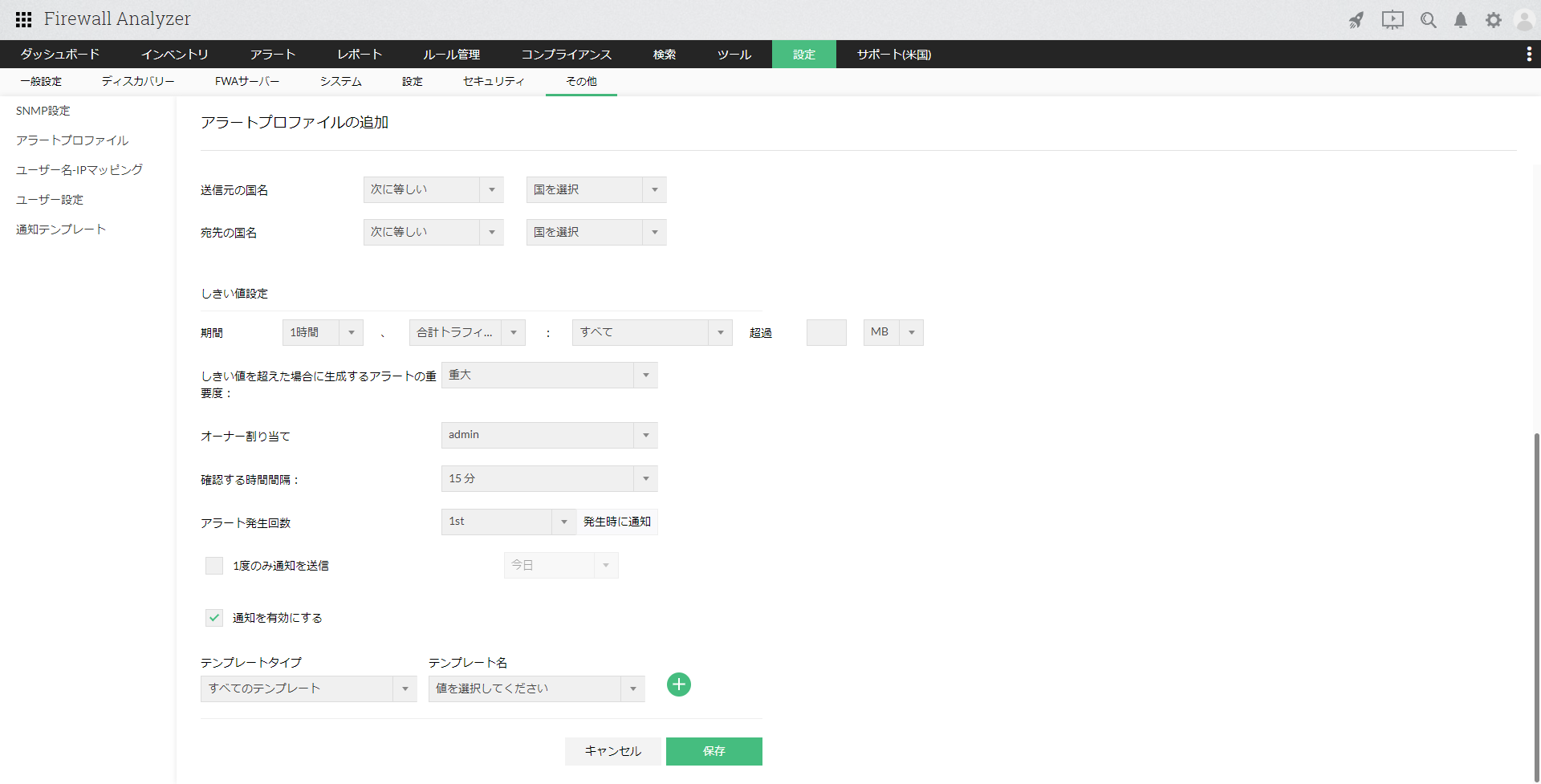 指定した条件に合致したログをFirewall Analyzerが受信した際にアラートを発報することができます。