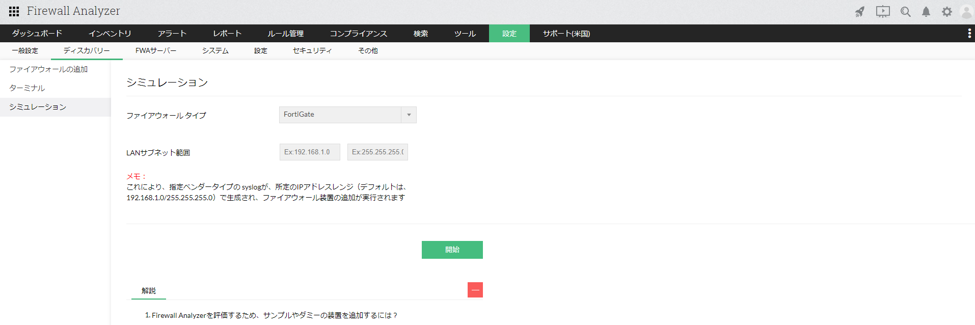 本機能では、Firewall Analyzer内でサンプルログを出力し、疑似データを用いてレポート化します。