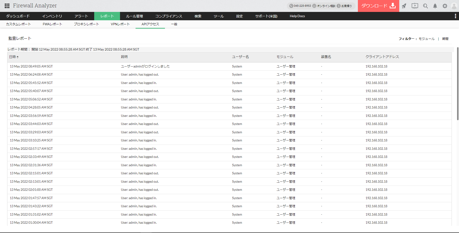 APIアクセスレポートならびに一般レポートでは、Firewall Analyzerのユーザーアクティビティを監視し、利用状況の確認に使用します。
