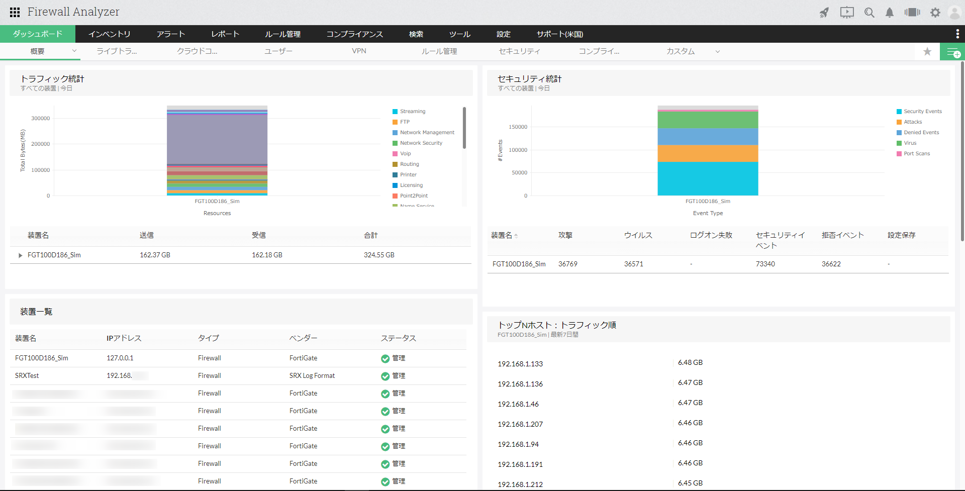 本ページでは、Firewall Analyzerにログイン後、デフォルトで表示される[概要]タブについて記載します。