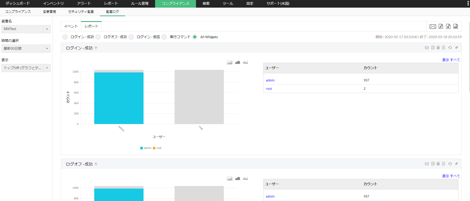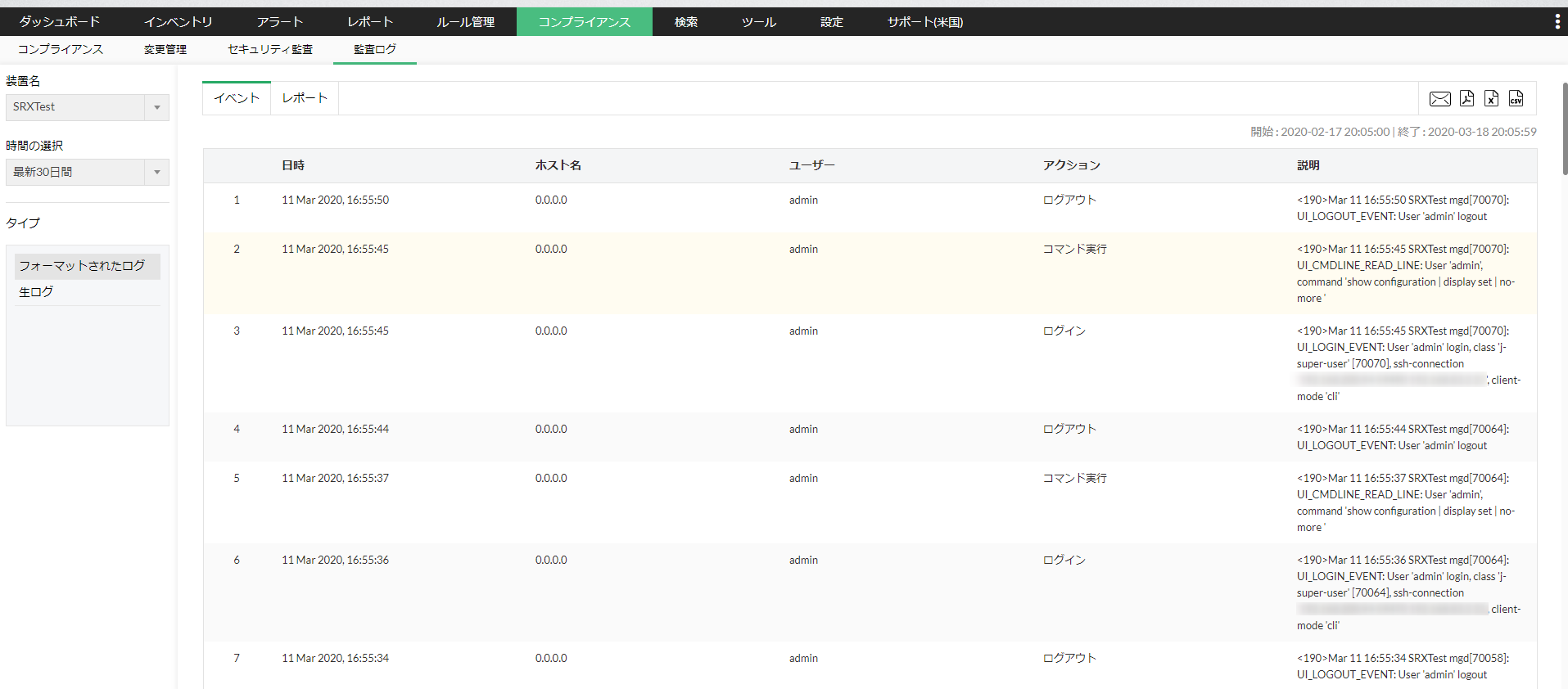 [コンプライアンス]配下の監査ログレポートでは、管理対象FW装置に対するアクション(ログイン、ログアウト、コマンド実行)情報と実行日時、ユーザーを表示します。