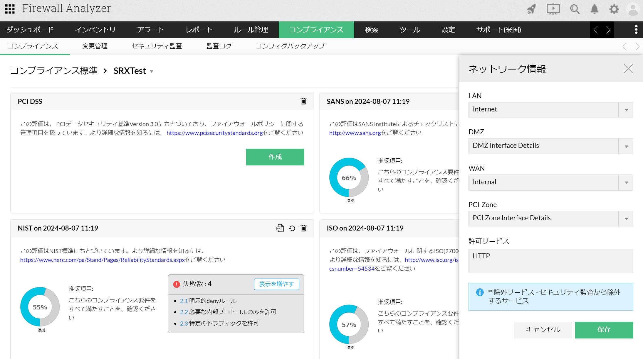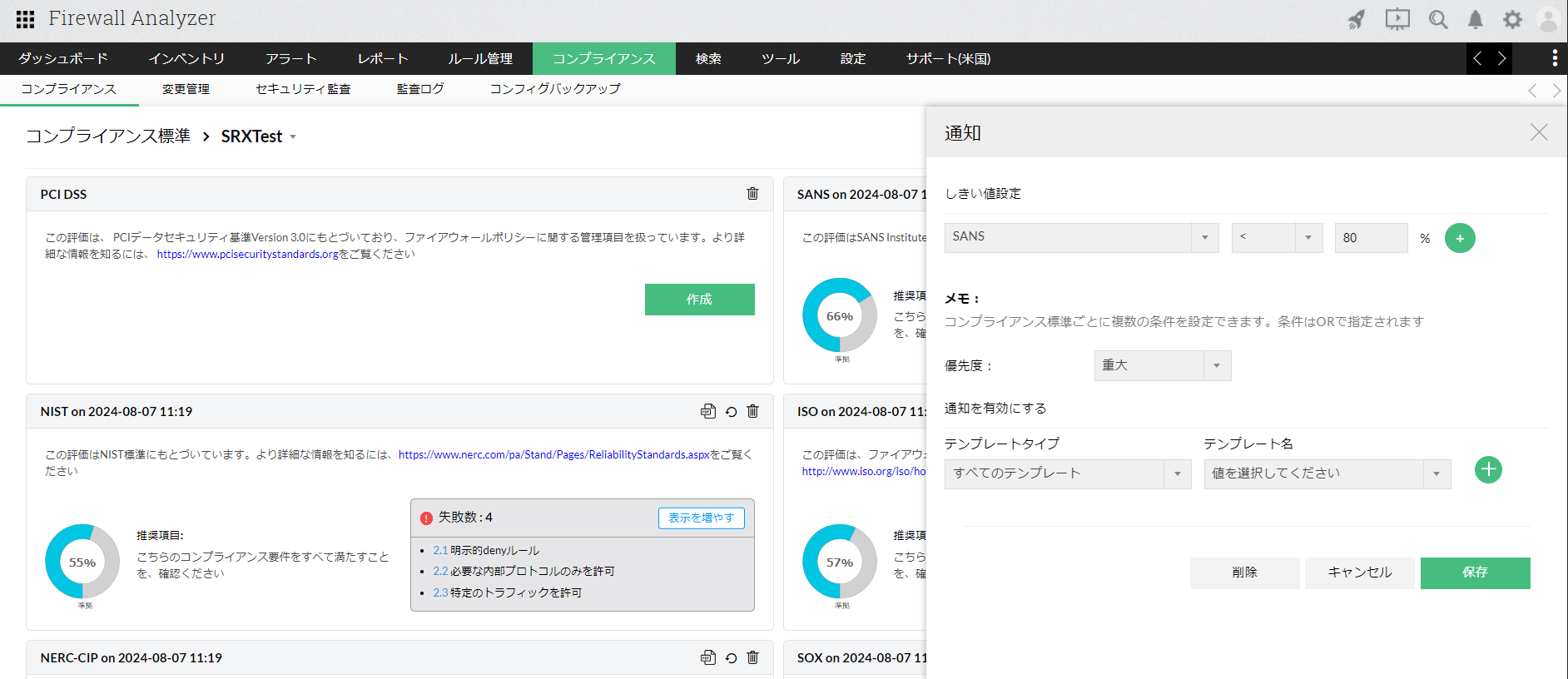 [コンプライアンス]配下のコンプライアンスレポートでは、管理対象FW装置に設定されているルール、コンフィグに関して、