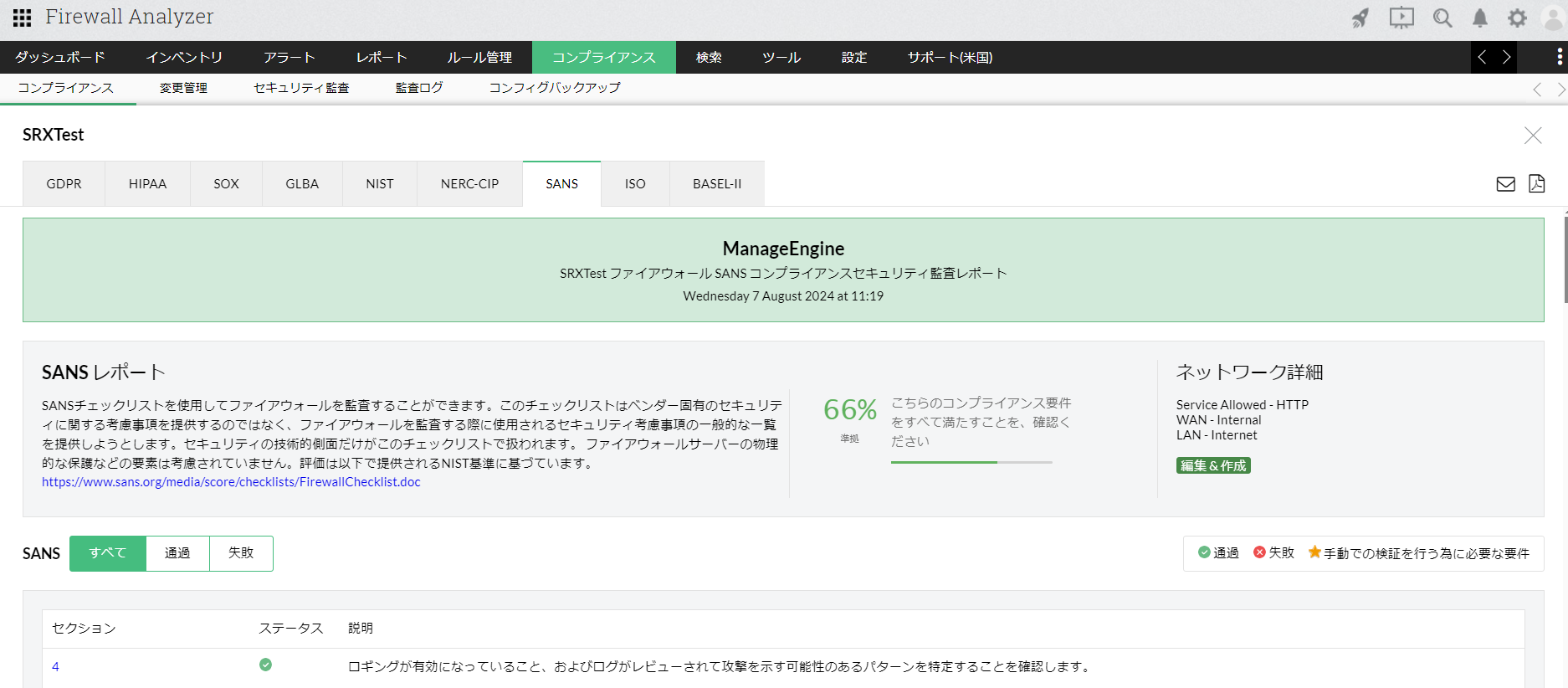 各セクションでは、それぞれの業界で設けられているチェックリストに従って、対象FW装置のコンフィグ内容の準拠状況を表示します。