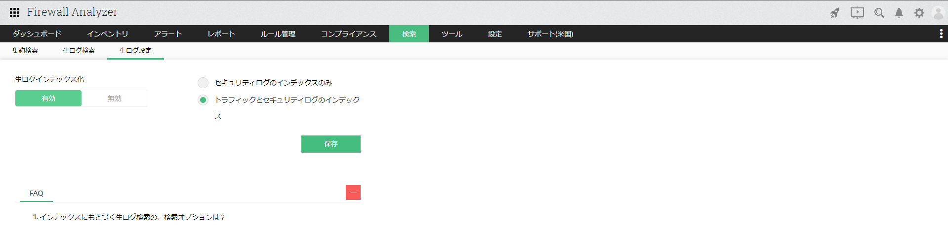 生ログ検索で、トラフィックログの検索を行う場合には、[トラフィックとセキュリティログのインデックス]にチェックを入れて、設定を保存する必要があります。