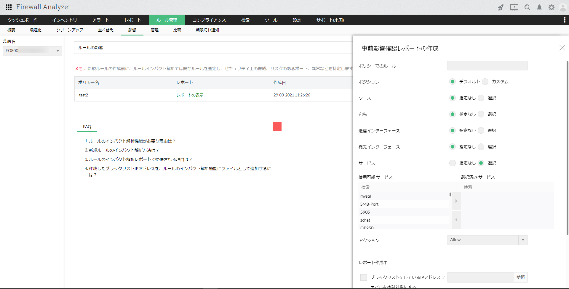 - 影響レポートでは、事前にルールの影響度合いの表示のみを行い、Firewall Analyzerからファイアウォールに対する設定変更は行いません。