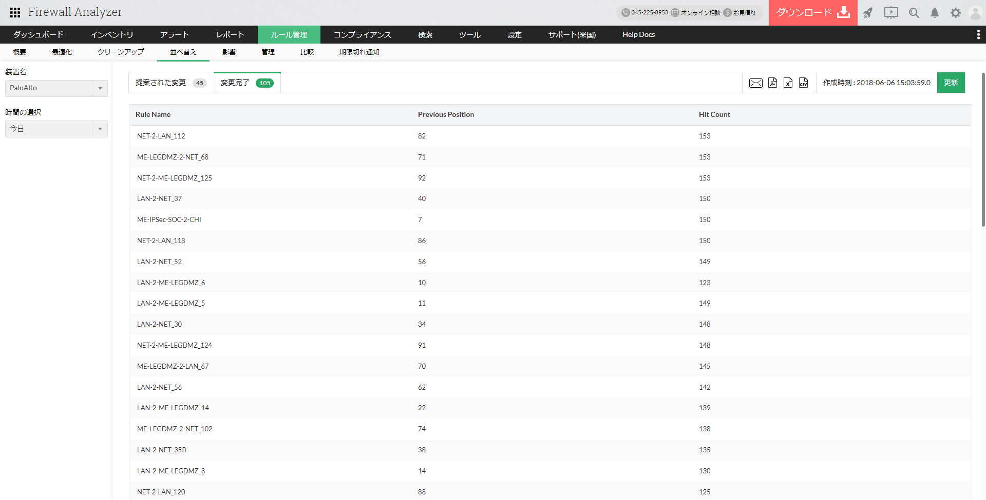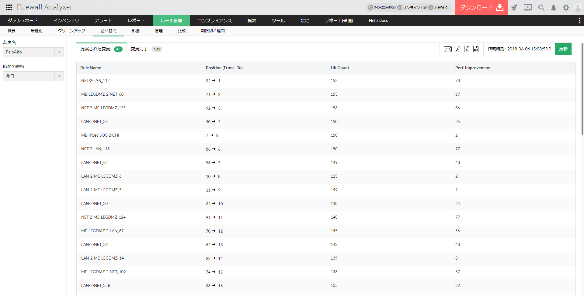 [ルール管理]配下の並べ替えレポートでは、使用されるルールのヒット数に応じて、最適なポリシーの配置を提案します。