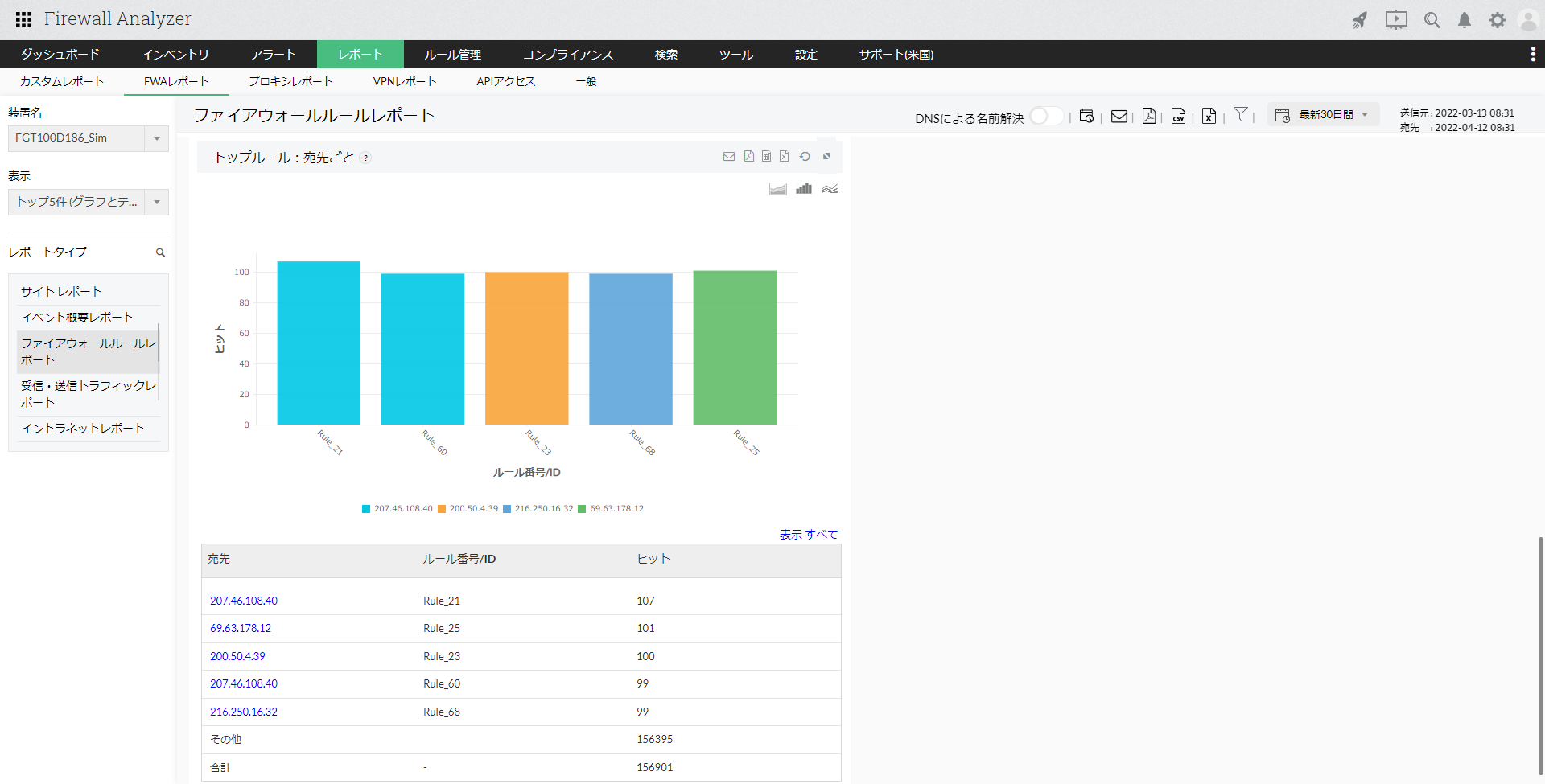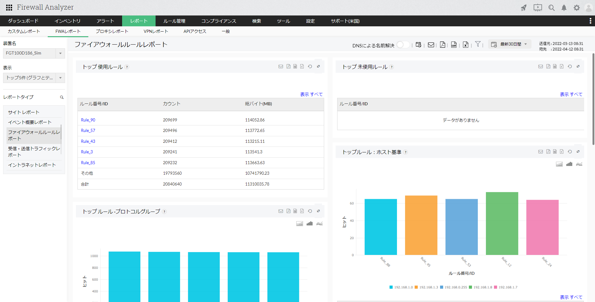 ファイアウォールルールレポートは、該当のファイアウォールに設定されているルールの使用状況を表示します。