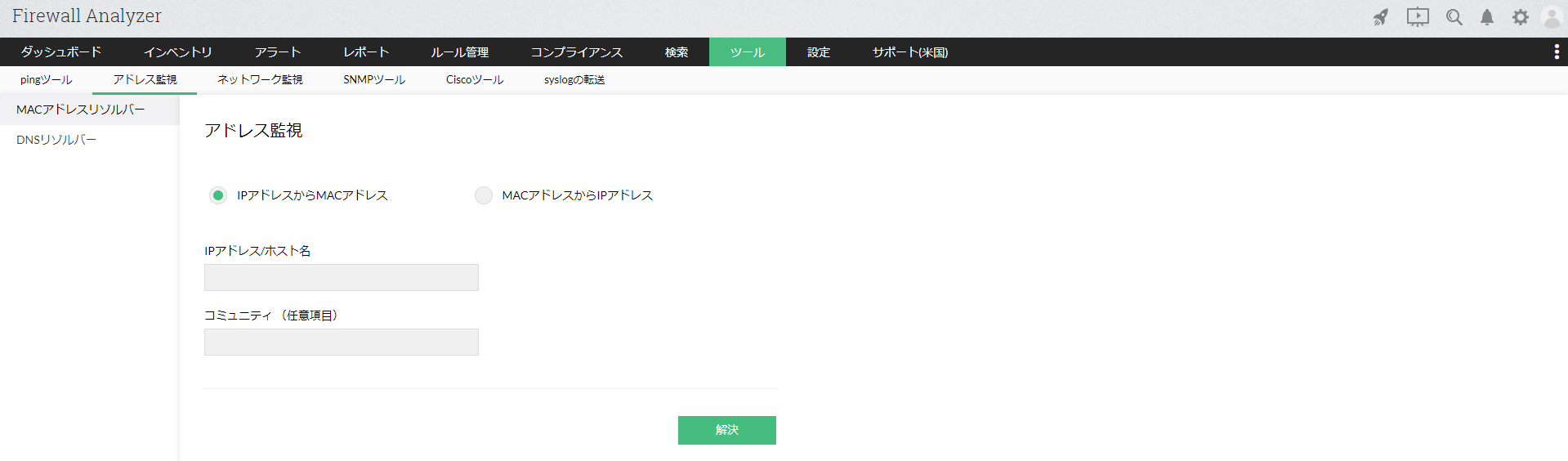 対象ホストのIPアドレス/ホスト名を値を入力し、[解決]をクリック。解決されたMACアドレスが表示されます。 - MACアドレスからIPアドレス: